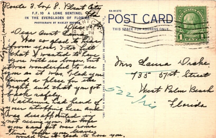 MAKE AN OFFER. THE MORE YOU BUY THE BETTER DEAL I WILL ACCEPT The postcard features a photograph of a lone sentinel in the Everglades of Florida, taken by Manley Brower. It is addressed to Mrs. Lama Drake in West Palm Beach, Florida. The sender expresses joy upon receiving a message from Mrs. Drake and mentions missing her.