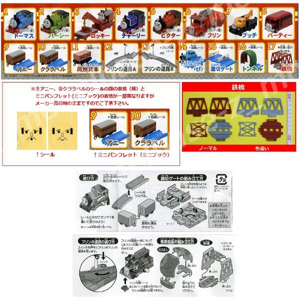 ● Thomas (wind-up car) ● Percy (wind-up car) ● Charlie (wind-up car) ● Victor (wind-up car) ● Flynn (wind-up car) ● Rocky ● Butch ● Birdie ● Annie + straight rail ● Clarabel + curved rail ● Luggage car + straight rail ● Flynn's Road A + Flynn's included parts ● Flynn's Road B + Flynn's included parts ● Sir Topham Hatt + sedan + curved rail ● Crossing gate + straight rail ● Tunnel + straight rail ● Iron bridge (normal version) ● Iron bridge (different color version) 18 types. ・Brand new and unused. ・Includes 18 mini books. If you have any questions about other product details, please contact us before purchasing. Thank you for understanding. For "remote delivery areas", additional fees will be charged. Import duties,taxes and charges are not included in the item price or shipping charges. These charges are the buyer's responsibility. These charges are normally collected by the delivering freight(shipping) company or when you pick the item up. -do not confuse them for additional shipping charges. We do not mark merchandise values below value or mark items as "gifts". -US and International government regulations prohibit such behavior.