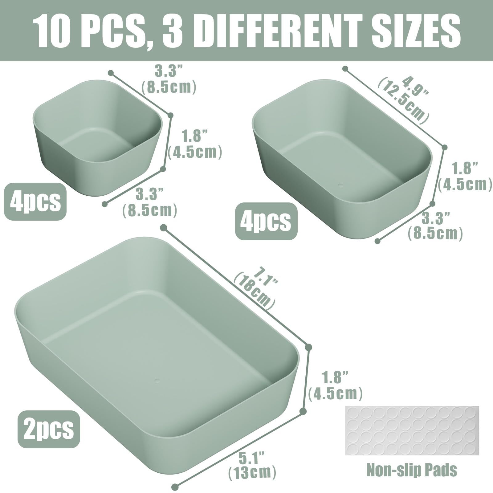 Plastic Drawer Organizers, 10 PCS Drawer Organizer Bins, Bathroom and Vanity Organizer Plastic Tray, Makeup organizer and storage for Makeup, Bedroom, Kitchen Gadgets Utensils and Office (Green) 【Multifunctional】These versatile drawer dividers trays are suitable for various locations in your home, which can be makeup organizer for vanity, junk drawer organizer, drawer organizer tray, bathroom drawer organizer and office organizer. It can be used to organize cosmetics, makeup tools, hair accessories, jewelry, pins, office supplies, craft materials, utensils, and more. 【Multiple Sizes】 10pcs customizable drawer bins includes 3 sizes: 3.3" x 3.3" x 1.8" (4 pcs), 4.9" x 3.3" x 1.8" (4 pcs), 7.1" x 5.1" x 1.8" (2 pcs), you can customize the combinations, It’s easy to find a configuration that works for your drawers or desktop. 【Non-Slip Pads】Drawer organizer tray fitted with non-slip pads that stick to the bottom of the plastic drawers organizer to prevent the drawer from moving. Prevents office drawer organizer from moving when you open or close them, reducing drawer wear and tear. 【Quality Materials】 Bathroom drawer organizers made of durable plastic, sturdy and durable. Drawer organizer bins can be easily cleaned with mild soapbox water, so it will last for a long time. Note: Do not put it in the dishwasher! 【Stackable】When not needed to use bathroom drawer organizer trays, organizer drawers storage can be stacked together, which can save a lot of space, you will find it very easy to keep everything in order! Shipping We offer FREE shipping on all orders! We ship within Three business days of payment, usually sooner. We use a selection of shipping services such as UPS, FedEx, USPS etc. We only ship to the lower 48 states, no APO/FPO addresses or PO Boxes allowed. Local pickups and combined shipping options are not provided at this time. Return You can return a product for up to 30 days from the date you purchased it. Any product you return must be in the same condition you received it and in the original packaging. Please keep the receipt. Payment We accept payment by any of the following methods: PayPal Please pay as soon as possible after winning an auction, as that will allow us to post your item to you sooner! Feedback Customer satisfaction is very important to us. If you have any problem with your order, please contact us and we will do our best to make you satisfied. Contact Us If you have any queries, please contact us via ebay. We usually respond within 24 hours on weekdays. Please visit our eBay store to check out other items for sale! Thank you for shopping at our store.