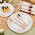 Return Policy Fast Delivery Trusted seller 100 Pack Rose Gold Plastic Silverware with Pre Rolled Napkins for 100 Guests, Heavyweight Rose Gold Disposable Utensils Sets Includes 300 Plastic Cutlery, and 100 Napkins for Christmas Product Description EXQUISITE DESIGN: These rose gold plastic utensils are beautifully designed in a vintage style with beautifully engraved handles, pursuing the perfect combination of detail and texture. The rose gold plastic silverware is perfect for placing on your dining table, adding a touch of luxury to your dining experience. PREMIUM QUALITY: The rose gold plastic cutlery is made from 100% food grade, BPA free, easy to cleanup, definitely worth the budget. Moreover, these disposable utensils are constructed with heavy duty plastic, enhancing their strength and durability, making them resistant to breakage during use. PERFECT FOR ANY OCCASION: These rose gold plastic silverware sets are suitable for wedding decorations, parties, dinners, get-togethers, birthdays, engagements, Valentine's Day, Christmas and other special anniversaries. Nothing adds sparkle to your party better than these disposable rose gold plastic cutlery. PACKAGING COMPONENTS: Our 300 pieces rose gold plastic silverware includes 100 plastic knives, 100 forks and 100 spoons, suitable for serving up to 100 guests. In addition, plastic cutlery set with 100 napkins suitable for weddings and parties, adding a touch of detail and perfection to your dining occasion. CONVINENT DISPOSABLE OR REUSABLE: The disposable rose gold plastic cutlery is perfect for parties and other occasions. They can be discarded after single use. However, they are constructed of heavy duty materials that can be washed with water then reused, and the addition of napkins enhances their usefulness. Shipping Returns Payment Shipping Shipping is FREE to all addresses other than APO/PO boxes in the lower 48 states. All our stock ships from US-based warehouses. Shipped via USPS or UPS (depending on location and package weight) Unless stated otherwise, all orders will ship within 24-72 hours of your payment being processed. Check our feedback to see the great reviews of FAST shipping we offer. Returns Seller does not accept returns Payment We currently accept payment via eBay managed payments only. Once payment is cleared, we will dispatch your shipment within 1-3 business days. Please refer to the "Shipping" tab for more information regarding shipping speed to your destination.