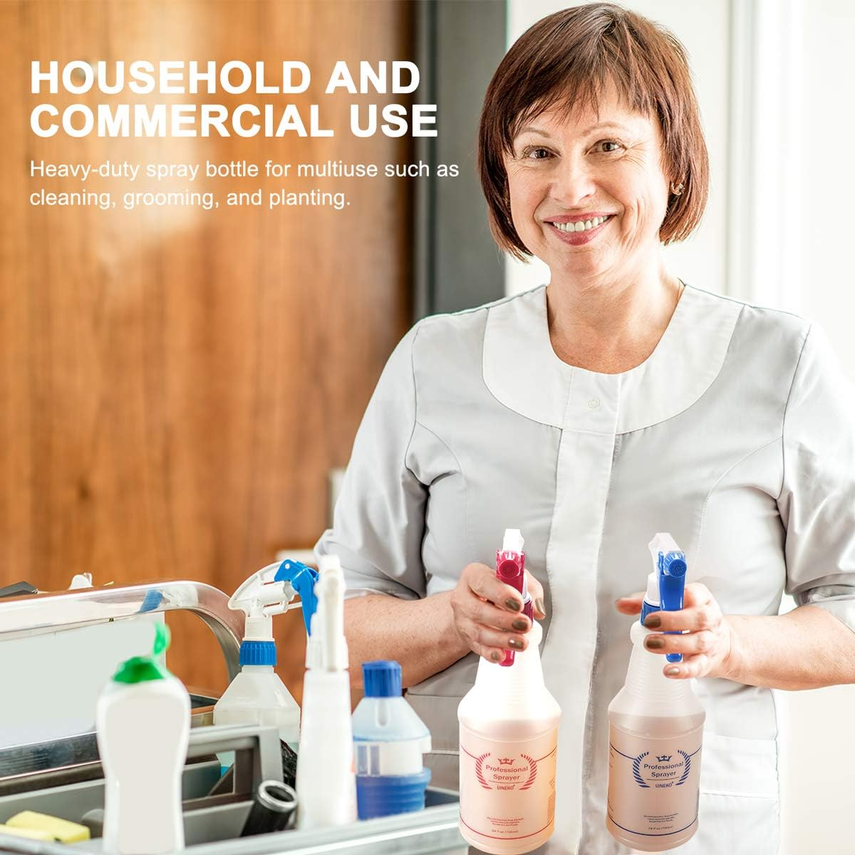 DURABLE BOTTLES WITH 3 COLORS - Our 24 ounce (about 700 ml) heavy duty spray bottles are made from HDPE plastic, recycle code # 2, which is chemically resistant, safe for chemical solutions. The empty spray bottles are with 3 different colors, also on the side of each bottle is a checklist to stay organized and remain informed as to what liquids the bottle contains. (Comes with labels to meet your need) UPGRADED SPRAY HEAD & LEAK PROOF - Our professional sprayer features a long lasting polypropylene spray head, tight and secure cap closure, internal cap gasket, 302 stainless steel spring and a precision valve and piston for a no clog and no leak experience; A proven and reliable no leak venting system primes quickly and stays primed. ADJUSTABLE NOZZLE - From a fine mist to a solid stream, the sprayer can be easily adjusted to suit your needs. Be prepared to tackle any job with a simple twist of the nozzle! Avoid waste with our extra-long tube that'll spray every last drop out! HOUSEHOLD-COMMERCIAL-INDUSTRIAL USES - Our plastic spray bottles is for multi purpose uses, each bottle is BPA-free, use them for food spraying, cleaning solutions around the house, pet, cat, lawn and garden, misting and watering plants, succulents, herbs, ironing, laundry, car cleaning, janitorial. Make your own homemade diy cleaner mister or just use with water to cool yourself. BETTER TRIGGER DESIGN - The unique design 3-finger trigger makes your fingers rest easily on it and the bottle fit comfortably in your hand, eliminating hand fatigue; The ergonomic neck gives you a comfortable grip; Pull trigger has a short effortless squeeze reducing finger fatigue. Product Description This essential set of four, 24 oz spray bottles is fantastic for both home and commercial use. The adjustable spray nozzle coupled with the original 100% no-leak mechanism will set off your cleaning or gardening tasks to a perfect start. Buy economy sized liquid cleaning products in bulk for less and decant the contents into these trusty home use bottles. The 24 ounce capacity plastic bottle is perfect for all natural household looking to create their own cleaning recipes for a healthier home. Try a homemade drain cleaner or air freshener, dusting spray or furniture polish! Keeping a few labeled bottles handy around the house enabling you to use for DIY cleaners to clean windows, mist plants, or spritz over bread dough before baking… whatever it is you decide to fill these bottles with, you are sure to get hooked! Our professional spray bottles is extremely durable and comes with the following 5 unique features: Adjustable Nozzle 24 oz Perfect Size Chemical Resistant Unique Design 3-Finger Trigger Measurements ADJUSTABLE NOZZLE Easily adjust between 3 trigger settings including mist, stream and off by simply turning the nozzle. BETTER TRIGGER The unique design 3-finger trigger makes your fingers rest easily on it and the bottle fit comfortably in your hand, eliminating hand fatigue. COMFORTABLE DESIGN The ergonomic neck gives you a comfortable grip; Pull trigger has a short effortless squeeze reducing finger fatigue. CHEMICAL RESISTANT Durable material makes sure that the bottle doesn’t deteriorate due to chemical exposure or harsh substances. DESIGN FOR COMFORTABLE WORKING 24oz great size, not too big and can hold enough liquid; 3 finger sprayer for a better grip HOUSEHOLD/COMMERCIAL/INDUSTRIAL USES Our multi purpose spray bottles can be used for cleaning solutions, grooming, planting and more. PACKAGE INCLUDE 3 * Plastic Spray Bottles 1 * Label (with 9 labels) Note: If the liquid contains powder, it may cause the nozzle or the tube to become clogged, so it is recommended to shake the liquid fully evenly before use. Ensure the cap is screwed on tightly. The bottles are resistant to leaking, but it's best to avoid leaving them on their sides when not in use.