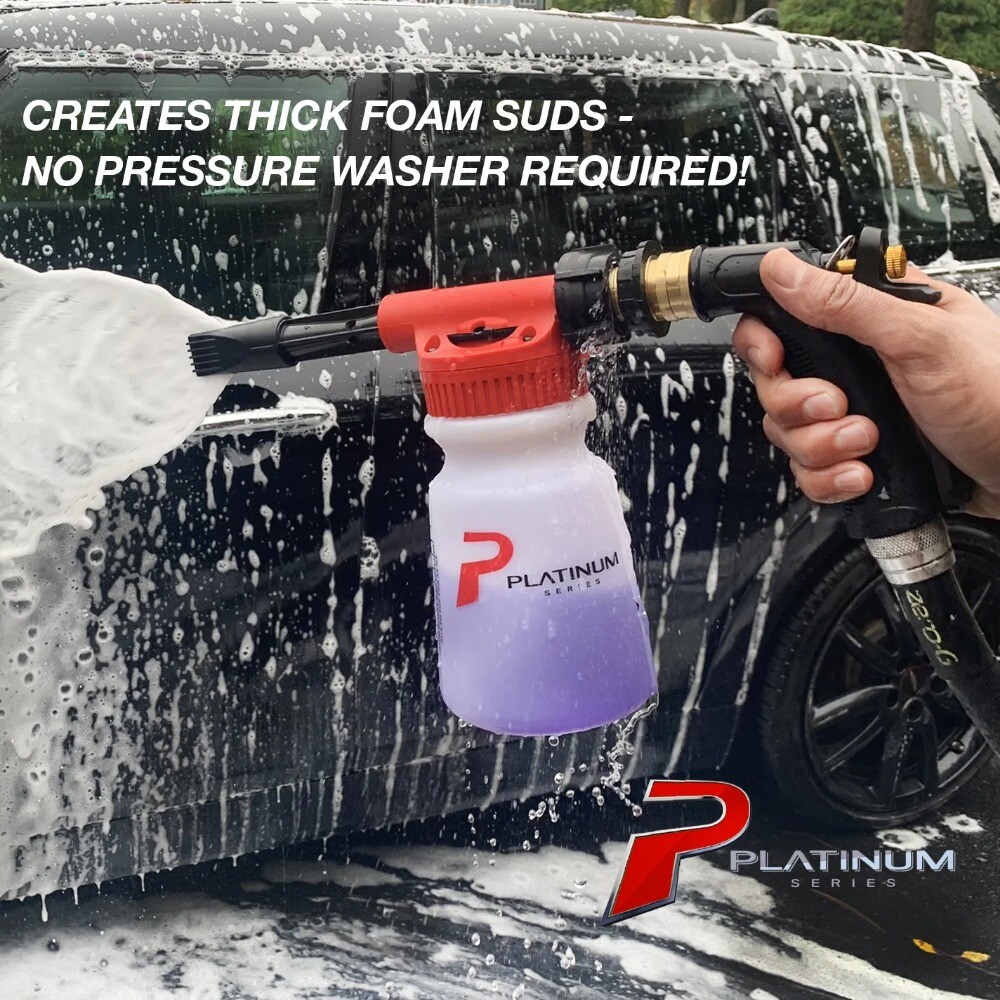 Every car care enthusiast knows that using a car wash foam sprayer is the ideal choice to lift dirt and grime away from paint or chrome surfaces. The Platinum Series Foaming Sprayer acts as a high-quality foam cannon covering your vehicle in with thick suds within seconds. Simply attach the sprayer to any standard size garden hose, spray, and saturate your vehicle in soap suds. Incoming water from the hose is mixed with air and car wash solution to create perfect car wash foam. The Platinum Series Foaming Sprayer easily CONNECTS TO ANY GARDEN HOSE and the adjustable spray nozzle allows to quickly switch over between foaming and rinsing. Be aware that improper car washing can cause dirt and grime that grinds into your paint surface and produces scratches. With the Platinum Series Foaming Sprayer, you can get spot-free, swirl-free results without causing any damage – and it’s fun to use! Generates thick suds, fits all standard garden hoses Heavy Duty quick release nozzle to switch from washing to rinsing High capacity 32 oz soap chamber Adjustable dial to control the flow of soap Contents: (1) 32 oz Canister, (1) Foam Blaster Nozzle, (1) Brass Quick Connect