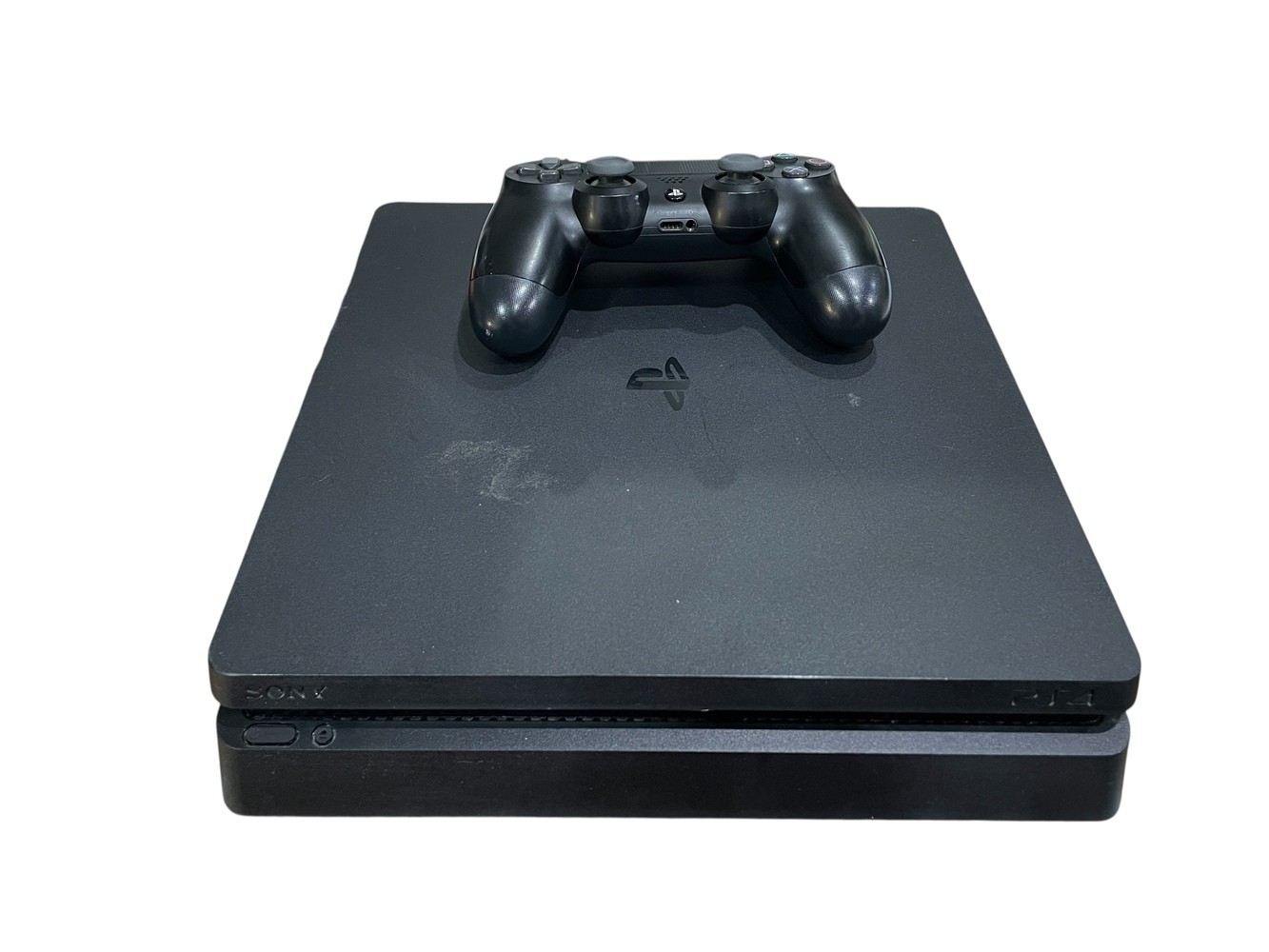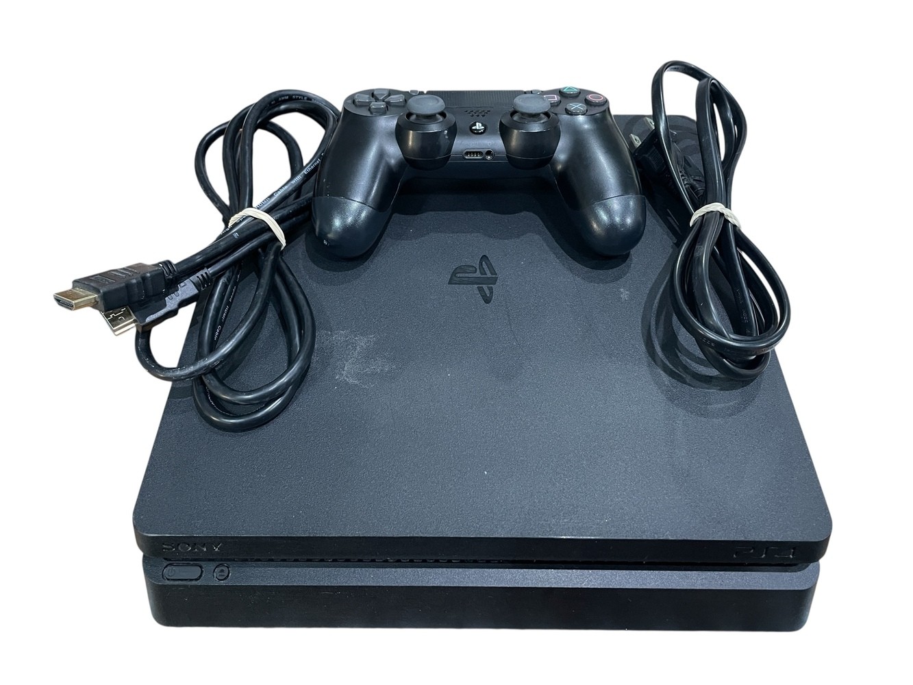 Sony PlayStation 4 Slim Console with HDMI, power cord and controller.