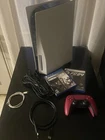 PlayStation 5- 825gb: Selling because I never actually used it and I already have a pc. Comes with: PS5 (duh) Vertical Stand Volcanic Red DualSense Controller (no drift) Power Cable HDMI 2.1 Cable USB-A to USB-C PS5 version of FC24 PS4 version of Rainbow Six Siege Cleaned. Runs as quiet and cool as a clam. As is. I pay for shipping.