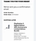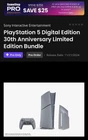 Introducing the limited edition PlayStation 5 Digital Edition 30th Anniversary Bundle! This bundle includes everything you need to start gaming right away, with the latest technology from Sony. The console is sleek and powerful, providing an unparalleled gaming experience. With this bundle, you'll get access to exclusive games and content, all on the cutting edge Sony PlayStation 5 Digital Edition. This console is perfect for anyone who loves gaming, and wants to take their experience to the next level. Don't miss out on this amazing opportunity to own a piece of gaming history! ***This is a confirmed *Preorder*. Will ship free within 3 business days of arrival with tracking confirmation, insurance, and signature. Thank you for your interest! Thank you for looking!
