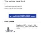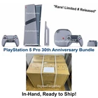 PlayStation®5 Pro Console - 30th Anniversary Limited Edition Bundle BRAND NEW In Hand, Ready to Ship! This is a rare limited edition bundle that is numbered to commemorate Sony's 30th anniversary of PlayStation. Includes: Limited Edition PS5® Pro console Limited Edition DualSense Edge™ wireless controller Limited Edition DualSense® wireless controller Limited Edition DualSense® Charging Station Limited Edition Console Cover for Disc Drive Limited Edition Vertical Stand 2TB SSD 2 Horizontal Stand Feet HDMI® cable USB cable AC power cord Original PlayStation™ controller-style cable connector housing 4 PlayStation™ Shapes cable ties PlayStation™ sticker Limited Edition PlayStation™ poster PlayStation™ paperclip Printed materials ASTRO’s PLAYROOM (Pre-installed game) EXPEDITED SHIPPING IS AVAILABLE