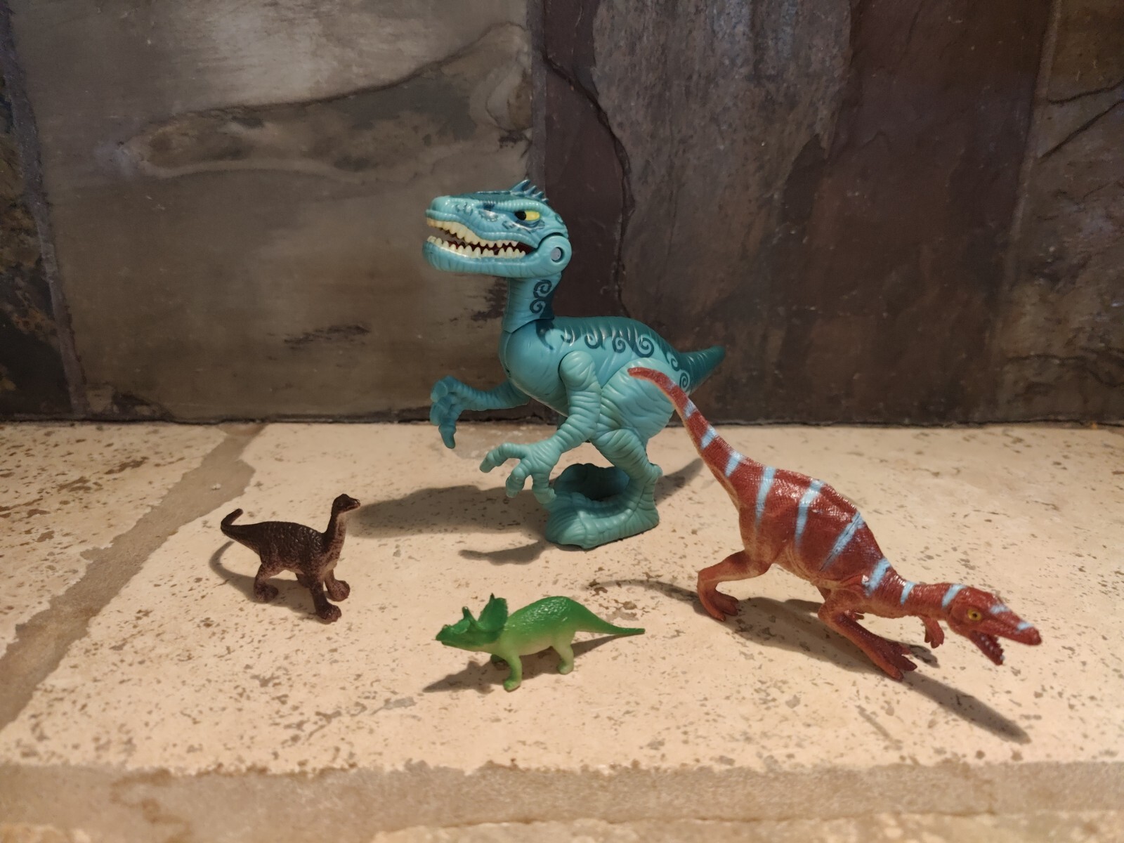 This Playskool Heroes Jurassic World action figure set includes a Velociraptor figure and three unbranded dinosaur friends. The set is perfect for any young fan of the Jurassic World movie franchise or the TV show Dinosaurs. All items are preowned showing typical signs of wear from age and use. (Toy5-3)