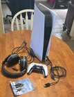 Used PlayStation 5 Disk version God of War Ragnarok edition. Includes all pictured here (there is a power cable as well), and unused code for God of War Ragnarok, a Turtle Beach wireless Stealth 700 headset with the USB transmitter. The console is used but is factory reset and in very good condition with no scuffs or scratches. It only had 2 games installed on it at the time of use. It is also the original controller and at last use did not show any signs of drifting or sticking. All pictured are sold as is, I do NOT have boxes for any of the items.