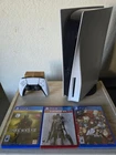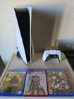 Hello, today I have for sale a lightly used Playstation 5 original disc version along with 3 extra games! This console has been used very lightly, I only ended up playing 4 games on it before cleaning it up and repackaging it. The console works perfectly and has been tested again before making this listing, as well as the controller. I've also made sure to include the necessary original HDMI cable and POWER cable, as well as the original vertical stand and all packaging and manuals. I have also included to include 3 games with it from my personal collection, those games being Persona 5 Royal, Bloodborne, and Dark Souls 3. If you have any questions regarding the console feel free to message me. Thank you for taking a look at my listing and I hope you have a great day!
