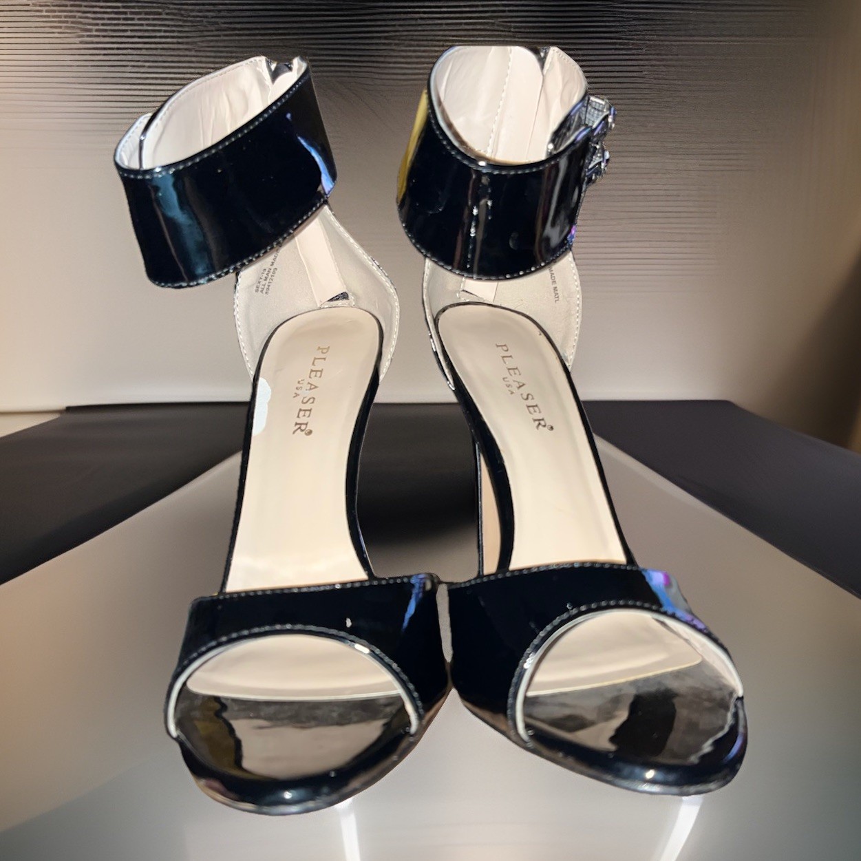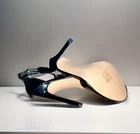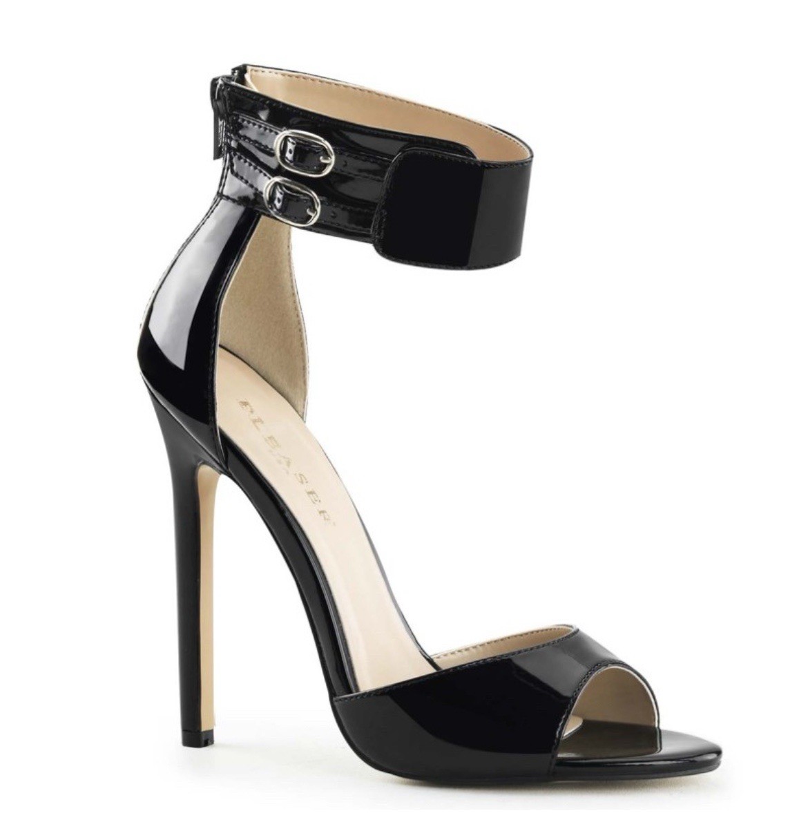 The Pleaser Night Club Stilettos are black patent leather women's heels with a 5" high stiletto heel, perfect for clubwear, party, or casual occasions. These ultra high heels feature an open toe, zip closure, ankle strap with buckle accents, and a platform style for added comfort and style. Made with a rubber outsole and fabric insole, these sexy heels are designed for year-round wear and come in a standard size 9. The sleek black color and designer theme make these heels a statement piece for any fashion-forward woman. Disclosure: The here shoes are new without the box.