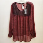 Pleione Top Womens 1X Red Black Lace Sheer Long Sleeve Blouse Boho Paw Print - NEW with Tags - Measurements in Photos - Returns acceptable within 30 days of purchase unworn, with tags attached, in original condition - Check out my E-bay Store. Lots of Choices Available. Reduced shipping for 2 or more items. Let me know before you pay so I can send you an invoice to discount the shipping