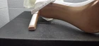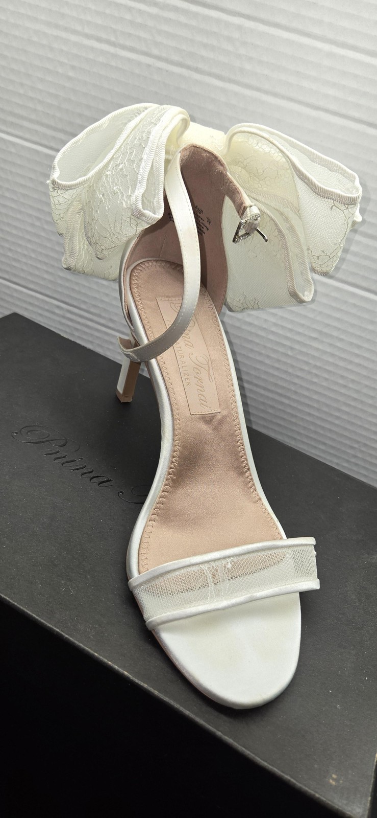 Brand: Pnina Tornai for Naturalizer Item: Womens heeled sandals; style name Amour in White. Size on box: US 8.5 M; UK 6; EU 39; 25 cm. Style/Model code: I6401F1100; Box label: AMOUR, WHITE; additional code: 5100497615 S3 (0223). UPC: 017118100577 Materials noted on inner print: Fabric upper, leather sock, balance man-made. Details: Open toe single-strap front with mesh overlay, ankle strap with rhinestone buckle, oversized lace bow at heel, slim stiletto heel, engraved "Love, Pnina" outsole. Comes with the original box (box may show shelf wear).