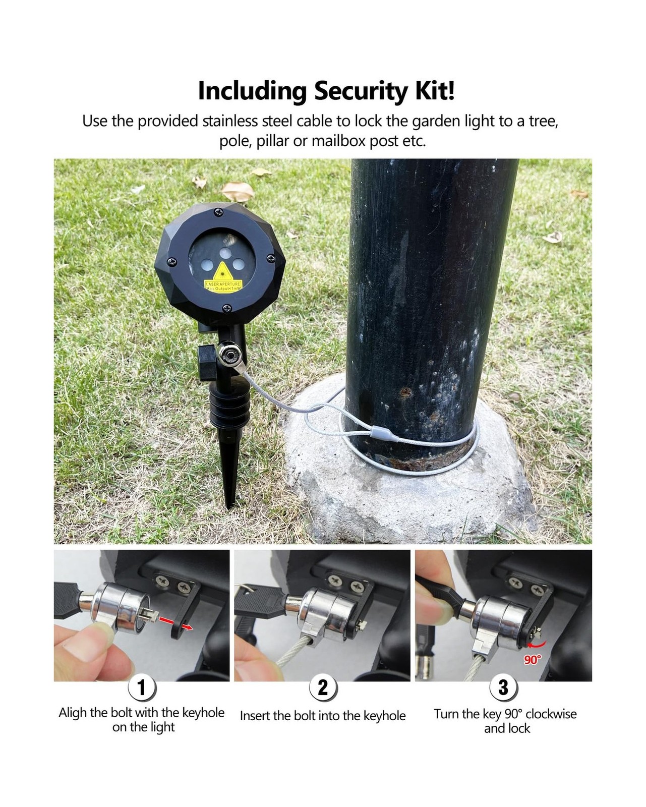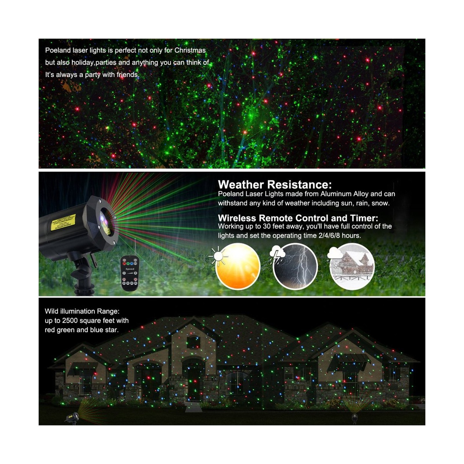 Poeland Christmas Laser Projector Lights Waterproof Outdoor Garden Decorative Lighting with Security Lock 3 Color Red Green Blue Description Features: Red+Green+Blue Classic laser projector. You will have the most shine, the most spectacular holiday lighting effects Our laser projectors bring theme park quality professional lighting to your home With a remote control, you can set the lighting mode, select the color, control the speed, and can also set the automatic cycle of 2, 4, 6, 8 hours through the timer of the remote control (need to keep the light always in the power-on state) Security kit/lock included, with indoor Base stage and outdoor stake extension, Occasions - This laser light with beautiful design has wide coverage area. Suitable for birthday parties, family parties, disco, dance halls, clubs, bars, weddings, roller skating, dance floor and so on. Product Details: Color: Red, Green, Blue Shape: Projector Material: Metal, Plastic Finish Type: Laser Light Source Type: Laser Color: Red, Green, Blue Shape: Projector Material: Metal, Plastic Finish Type: Laser Light Source Type: Laser Shade Material: Plastic + Metal Power Source: Corded Electric Brand: Poeland Item Weight: 2.69 Pounds Number of Batteries: 2 A batteries required. Style: Garden Voltage: 120 Volts Light Source Wattage: 10 Watts Mounting Type: Wall Mount Bulb Features: Remote Control Compatibility, Color Changing, Automatic Timer Number of Light Sources: 1 Are Batteries Included: No Product Dimensions: 7.2"L x 7.5"W x 5.4"H Beam Angle: 10 Degrees Manufacturer: Shenzhen X Photoelectric Technology Co., Ltd UPC: 768390641837 Wattage: 24 watts Part Number: X-33P Item Weight: 2.69 pounds Item model number: X-33P Batteries: 2 A batteries required. Is Discontinued By Manufacturer: No Size: Moving model Finish: Laser Item Package Quantity: 1 Special Features: Instant On Usage: Garden Included Components: Christmas Projector Light Batteries Included?: No Batteries Required?: No Warranty Description: 12 months warranty. Date First Available: July 13, 2017 Delivery We Do Not Ship Outside of the Continental US. Return Policy All items qualify for returns within 30 days of receipt. Seller is responsible for return shipping on any item that is not damaged. Feedback We take our reputation seriously, we buy and sell online, so we understand the value of trust. If you are unsatisfied with your order, please contact us and we will work with you to resolve it to your satisfaction.