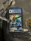 This is a rare and coveted Pokémon TCG card featuring Rayquaza GX from the Hidden Fates set. It is a Black Star Promo card with a full art finish and a holographic appearance. The card is a Basic stage Pokémon with dragon-like attributes and was manufactured in 2019 by The Pokémon Company. The card is in English and has a CGC grade of 9. The illustrator, 5ban Graphics, also contributed to the card's design.