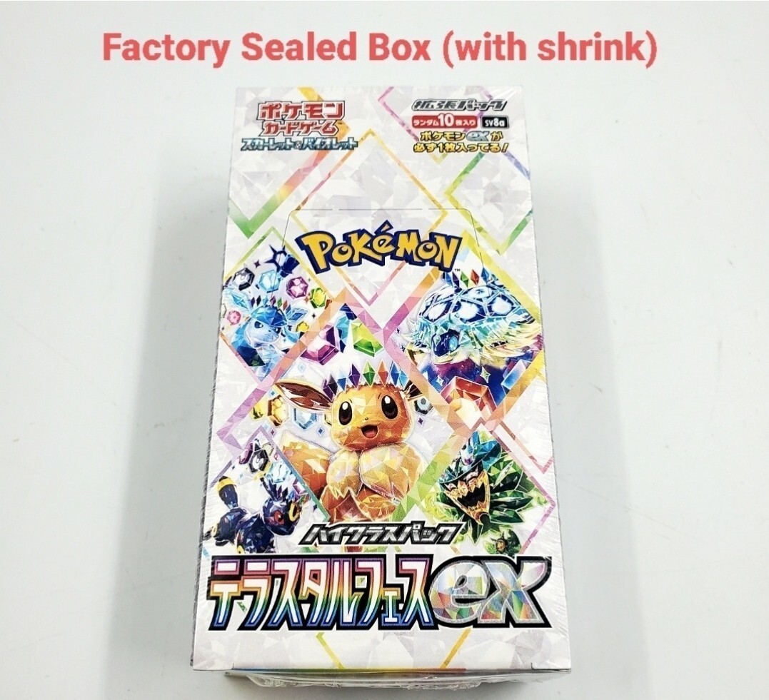 SAFE & SECURE SHOPPING 100% SATISFACTION GUARANTEED FAST SHIPPING Pokemon Card Terastal Festival ex Booster Box sv8a w/shrink Japanese Product Description Hello, Dear Welcome to our store! Hope you will have a great shopping experience here. Here are something should be noticed before you placing an order 1. All products are 100% official authentic. 2. We cooperate with offline card stores. Many players will send their cards to us for sale, mainly Pokémon and One Piece(Cards and Booster Box) 3. The serial number of the PSA Graded Card on the picture is erased. This is because there are multiple stocks with different serial numbers. 4.All cards are in circulation - grade condition. While we strive to offer high - quality cards, we cannot guarantee a PSA 10 rating for every single card. Card conditions may vary slightly. 5. We operate a no - return and no - exchange policy for these Pokémon cards. However, if you'd like to preview pictures of the cards before shipping, simply leave a note in the order remarks. We'll send you clear pictures for confirmation before dispatching your order. 6. Should you not receive your order or encounter any issues with the cards, please refrain from leaving negative feedback or initiating disputes. Instead, reach out to us immediately. Our dedicated customer service team is committed to providing you with the best possible solution in a timely manner. 7.All our Pokémon cards are sleeved with card protectors and top loaders as soon as they are opened. Due to our large inventory, we cannot inspect each card individually. We guarantee that there are no human-induced defects, but we do not offer returns or exchanges for factory defects from the manufacturer. About delivery: Normally, We use SpeedPak, which usually takes 8-12 days to arrive. If you need it urgently, you can contact us and pay more to upgrade the delivery to DHL express, which only takes 2-5 days to arrive. Copyright © 2022 Tongtool