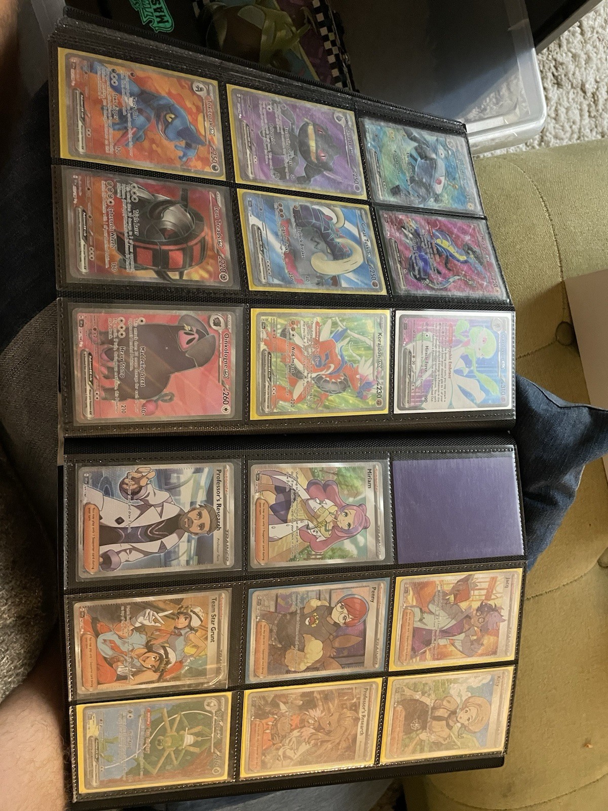 Pokemon collection scarlet and violet base set complete missing some reverse to deck charzard and okie doke ex over 600 bulk cards lot of golds full arts. Please reach out if you want more pictures of info