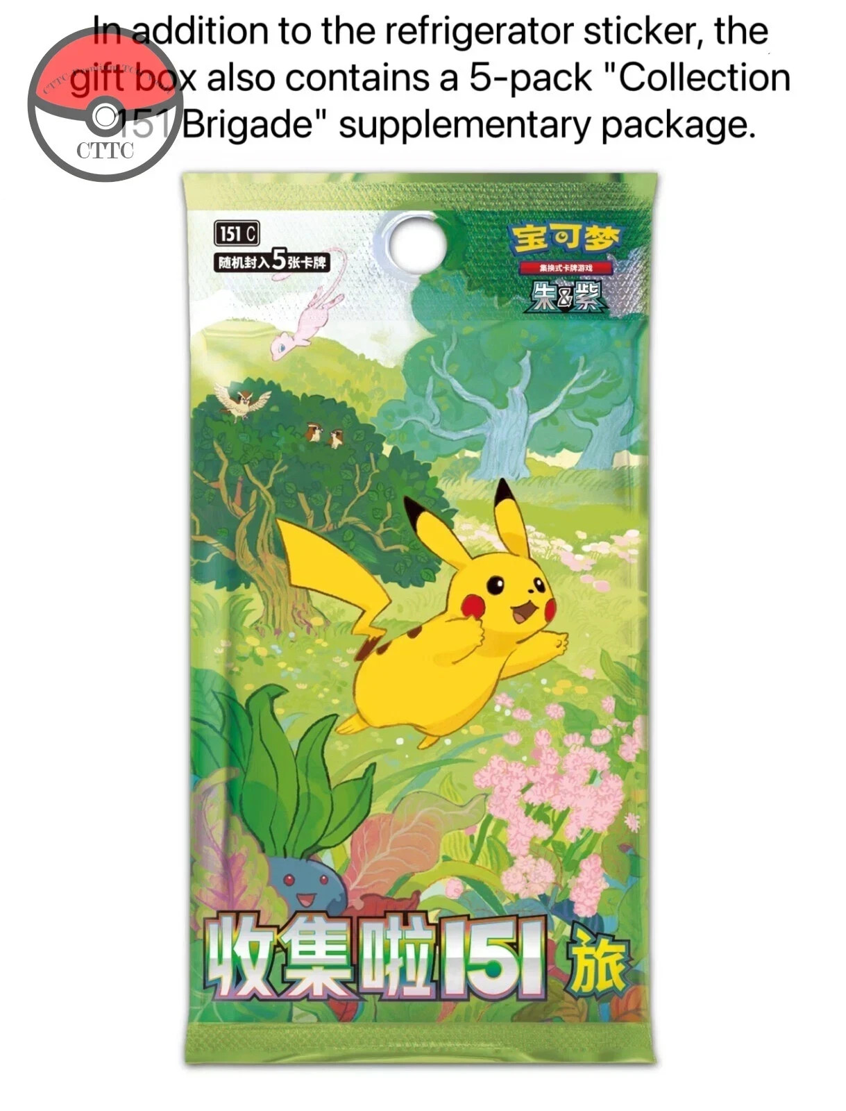 Nintendo Official Pokemon Chinese Products: the "Collect 'Em All 151 Puzzle Fridge Magnet Set" . This set includes one random Pokémon puzzle fridge magnet (out of a total of 151 designs, with one being a secret version) and one "Collect 'Em All 151 Journey" booster pack containing five cards. The fridge magnets are made of metal material , with each design corresponding to one of the 151 Pokémon (Pokédex No. 001-151) . The background colors are themed according to nine different attributes : Grass, Fire, Water, Electric, Psychic, Fighting, Dark, Colorless, and Dragon—creating a vibrant and colorful collection. Since all magnets share a similar shape and feature interlocking edges , trainers can freely mix and match different designs, assembling them like a puzzle to create their own personalized Pokémon fridge magnet wall . In addition to the fridge magnet, the gift box also includes one "Collect 'Em All 151 Journey" booster pack containing five cards. 100% Nintendo authentic pokemon products ! Please note this is Chinese Version ! Chinese Pokemon Card has blue back like English version. 100% authentic nintendo products, made in Japan, released in China Mainland.