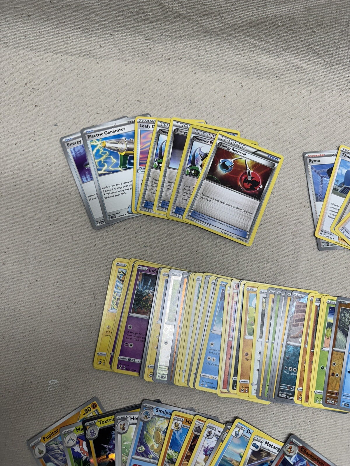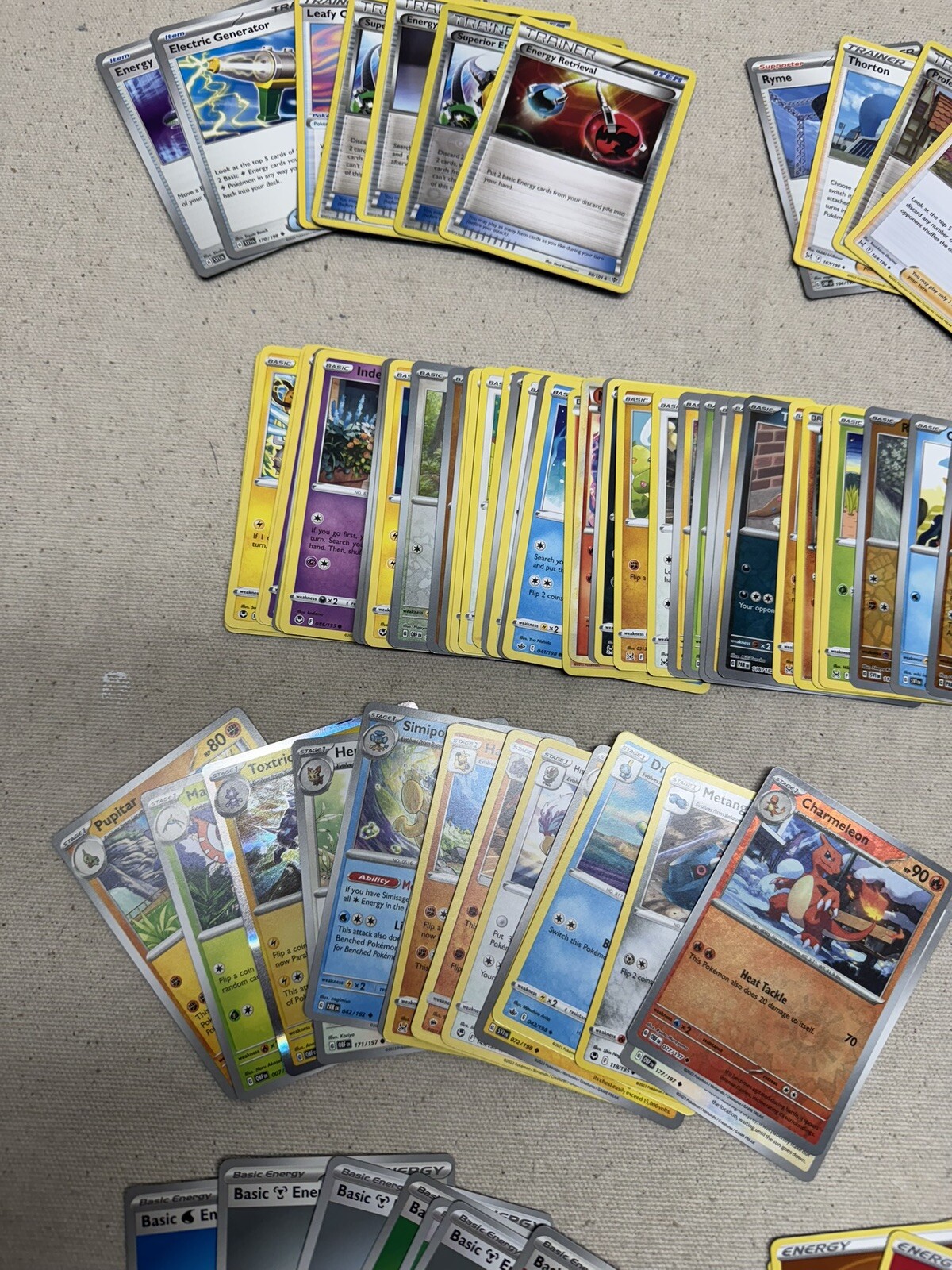 This product is an assortment of Pokémon trading cards that includes various types of cards from random collections, along with 3 coins. The cards are printed in English and manufactured by Nintendo, specifically for the Pokémon Trading Card Game. This collection would be a great addition for fans of the Pokémon TCG looking to expand their card collection with a variety of cards and some collectible coins to enhance their gameplay experience. Here's the breakdown of the types of cards: 30 Basic characters 14 Stage 1 characters 5 stage 2 characters 7 Basic energy 3 Regular energy 2 Special energy 9 Trainer/Item 4 Trainer/Supporter 1 Trainer/Pokemon tool
