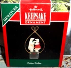 We Have For Sale A USED->Approx 1 Inch Tall-> Miniature Hallmark Tree Ornament... ( 1 ) Hallmark Ornament / Polar Bears Dancing On A Ice Block Dance Floor... ( 2 ) Type / Polar Polka Ornament...Polar Bears Love To Dance... ( 3 ) Collector's / It Has A Unique Hanger,It Looks Like A Pair Of Ice Tongs... ( 4 ) Year / 1992 ( 5 ) Lighted / None, ( 6 ) Box Condition / Box Is Very Nice-Look At Pictures-Check Out Our Other Hallmarks In Our EBAY STORE.. ( 7 ) Ornament Condition / MINT IN BOX.. SHIPPING WITH TRACKING IS FREE TO THE USA... -->>ALL OUR ORNAMENTS SHIP TO YOU IN BRAND NEW BOXES-NOT ENVELOPES OR SOMEONE ELSE'S SECOND HANDED USED BOXES-STAY SAFE...