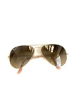These are Ray-Ban RB 3025 001/51 Aviator Sunglasses in a gold frame with brown gradient lenses. They are unisex pilot-style sunglasses with a metal frame and glass lenses providing 100% UV protection. These designer sunglasses have a lens width of 58 mm, bridge width of 14 mm, and temple length of 135 mm. Made in Italy, they offer a stylish and fashionable accessory for both men and women.