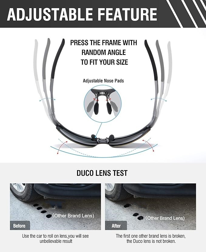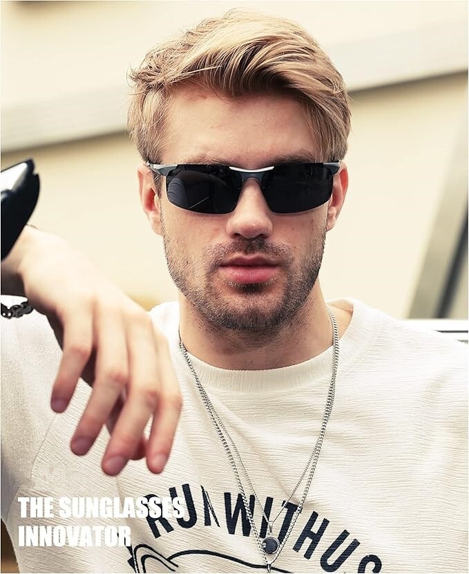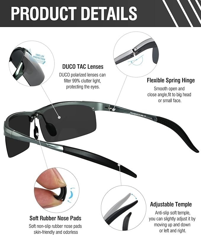 【Lentes polarizadas TAC】El revestimiento de protección UV400 filtra eficazmente la radiación UVA y UVB, proporcionando una protección solar completa. Elimina la luz reflejada o dispersa para restaurar la verdadera percepción del color. Las lentes de triacetato polarizadas TAC cuentan con cualidades como resistencia al impacto, resistencia a los arañazos, diseño liviano y durabilidad. 【Marco de aleación de metal AI-Mg】Fabricadas con marco deportivo de metal Al-Mg, estas gafas de sol son irrompibles y resistentes a la corrosión. Las almohadillas nasales suaves ajustables y la bisagra de metal flexible garantizan un ajuste cómodo, mientras que las puntas de las patillas talladas ofrecen un agarre antideslizante y la capacidad de doblarse en cualquier ángulo. A pesar de su construcción robusta, pesan solo 25 g, lo que las hace extremadamente cómodas de usar. 【Dimensiones del producto】Altura de la lente: 40 mm (1,57 pulgadas) - Ancho de la lente: 68 mm (2,67 pulgadas) - Longitud de la patilla: 126 mm (4,96 pulgadas) - Puente nasal: 16 mm (0,62 pulgadas) - Longitud del marco: 144 mm (5,67 pulgadas). 【Accesorios y paquete completos】Las gafas de sol vienen con un estuche para gafas con un mosquetón para mayor comodidad, una caja de regalo para una presentación elegante, una bolsa de microfibra para un almacenamiento seguro, un paño de limpieza de microfibra para un fácil mantenimiento y una tarjeta de prueba de polarización. Con este paquete cuidadosamente seleccionado, es una idea de regalo maravillosa y práctica para amigos y familiares. 【Varios escenarios de uso】Diseñadas para el hombre moderno, estas gafas de sol polarizadas de semimarco son perfectas para una amplia gama de actividades al aire libre, como andar en bicicleta, conducir, pescar, viajar, hacer senderismo, correr, ir de compras y escalar. Con una variedad de opciones de lentes coloridas, pueden complementar sin esfuerzo diferentes estilos de ropa y servir como un accesorio de moda.