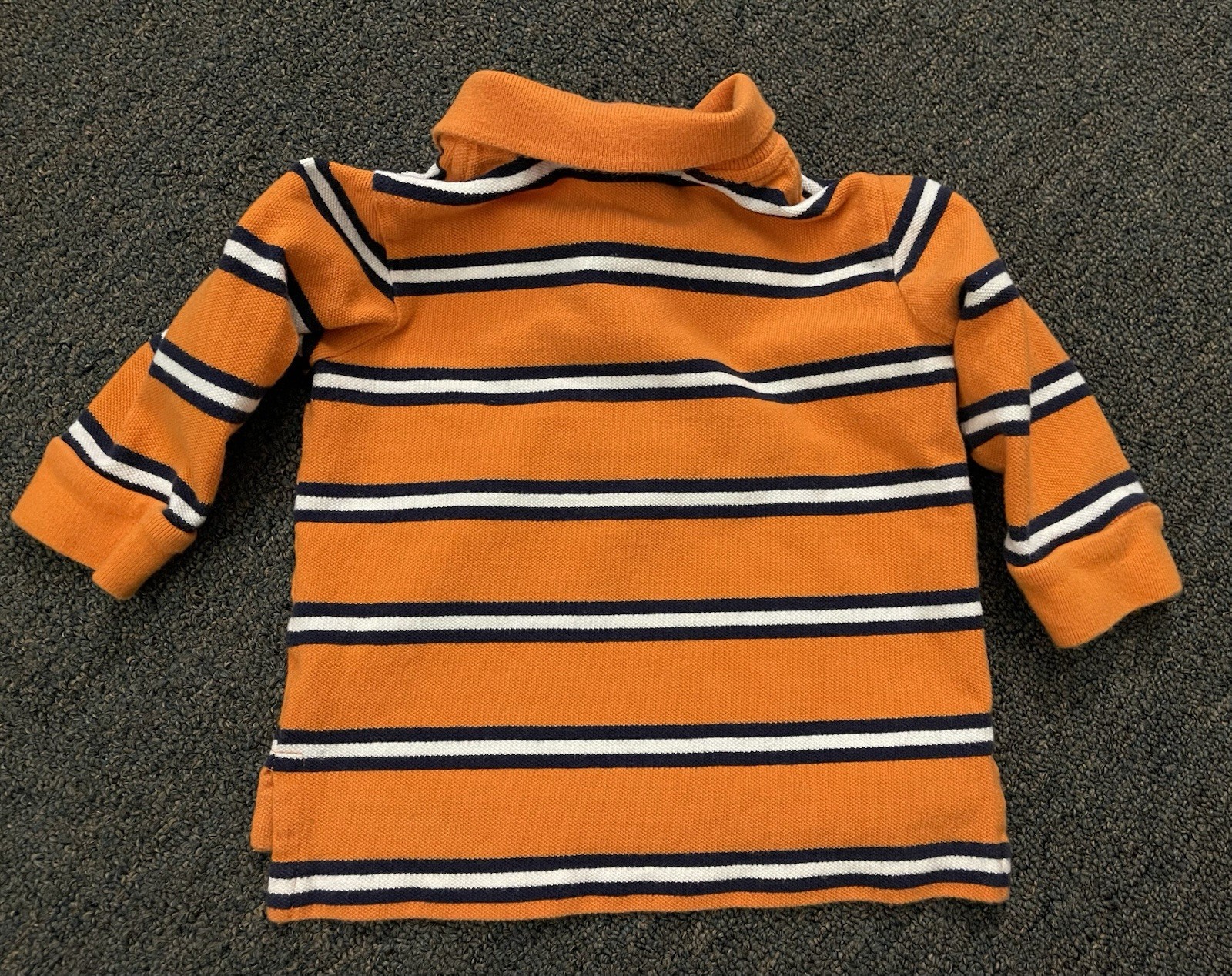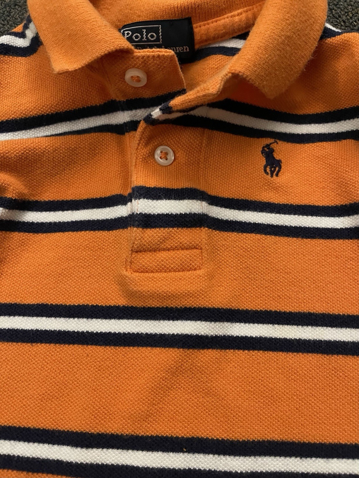 The Polo Ralph Lauren 9M Baby Boys Long Sleeve Polo Shirt in Orange and Navy Stripe is a classic and stylish addition to any little boy's wardrobe. Made from 100% cotton, this collared shirt features a button closure and long sleeves, making it perfect for casual occasions in all seasons. With the signature Polo Ralph Lauren logo accent and a preppy theme, this regular fit polo shirt is both stylish and comfortable for your little one. Easy to care for with machine washable instructions, this shirt is a must-have for any dapper baby boy.