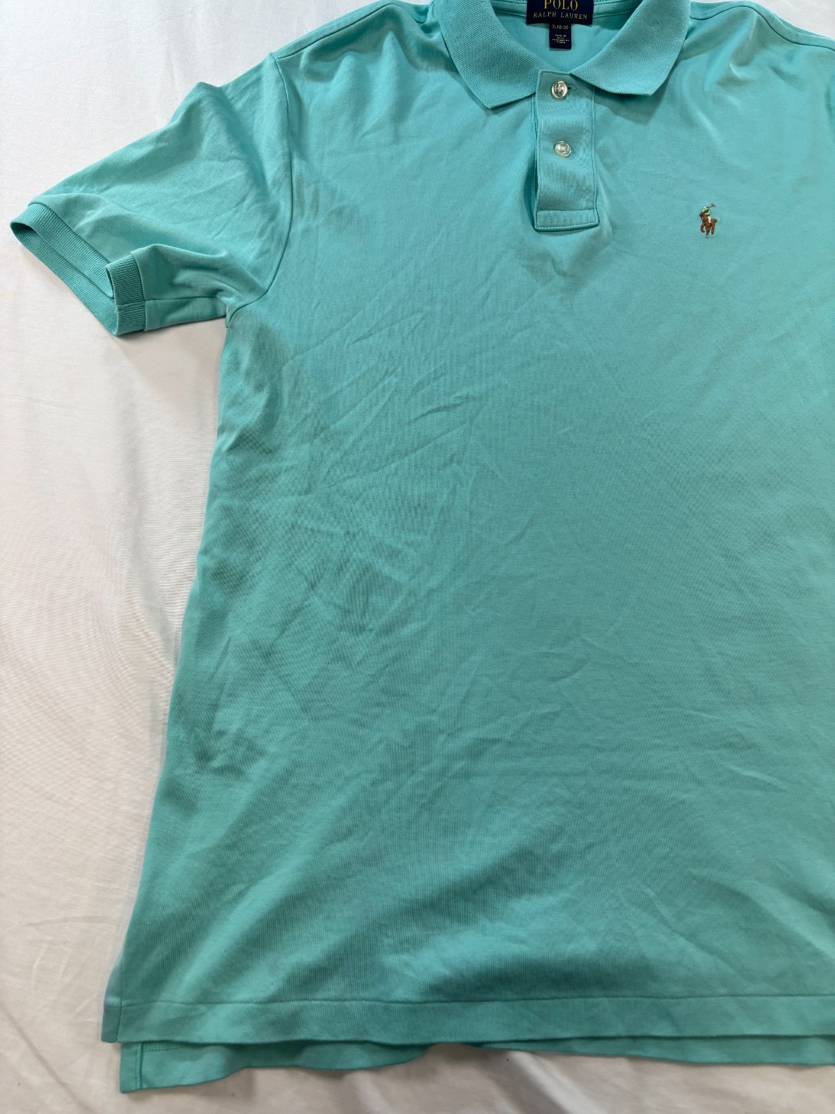 This Polo Ralph Lauren Boys XL (18-20) Shirt in Teal Green is a classic and stylish addition to any young boy's wardrobe. Made from 100% cotton with a soft touch fabric, this shirt features a collared neckline, button closure, and embroidered logo accents. Perfect for casual, party, or travel occasions, this shirt is lightweight and breathable, making it ideal for all seasons. With a solid green color and preppy designer theme, this Polo Ralph Lauren shirt is a versatile and timeless piece that can be worn for various activities such as walking, school, or church. **MEASUREMENTS IN PHOTOS** **FAST FLAT RATE SHIPPING** **STORED IN PET AND SMOKE FREE ENVIRONMENT** **ALL ITEMS SEALED IN WEATHERPROOF BAGS WHEN SHIPPED** Excellent Condition. No rips, tears, stains or smell.