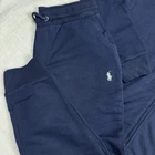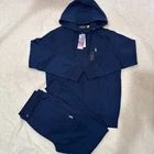 Elevate your activewear collection with this two-piece Polo Ralph Lauren tracksuit in a stunning Navy blue color. The set includes a hoodie and joggers, both made of comfortable and lightweight fleece material. The pullover closure and adjustable waist ensure a perfect fit for any occasion, whether it's a casual day out or a formal event. The tracksuit features a solid pattern with accents of a zip and the iconic Ralph Lauren logo. It's machine washable and easy to care for, making it a perfect choice for all seasons. The set is ideal for various activities, including cycling, running, gym training, and more. Get ready to look stylish and comfortable in this Ralph Lauren tracksuit.