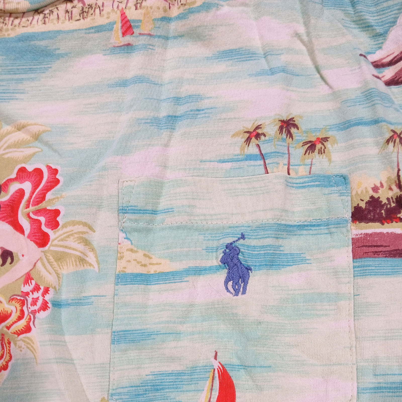 Authentic Polo Ralph Lauren men’s short sleeve T-shirt featuring a vibrant all-over Hawaiian/Aloha print. Includes island scenery, hula dancers, sailboats, palm trees, and the iconic Surfing Polo Bear graphic. Soft, lightweight fabric with a relaxed Classic Fit and a chest pocket with embroidered Polo logo. Perfect for summer, vacation, beachwear, or collectors of Polo Bear items Brand: Polo Ralph Lauren Size: Men’s Large Fit: Classic Fit Sleeve Length: Short Sleeve Neckline: Crew Neck Pattern: Hawaiian / Aloha / Surf Bear Color: Light blue / aqua multi-color Pocket: Yes (embroidered Polo logo) Style: Casual, Beach, Resort