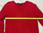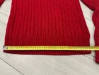 The Polo Ralph Lauren Jumper for women in size Large features a classic red cable knit design with the iconic chunky pony logo, embodying a preppy Y2K style. Made of machine washable cotton knit fabric, this pullover sweater has long raglan sleeves and a regular fit, perfect for casual occasions during the winter, fall, and spring seasons. The solid red color and Polo Ralph Lauren branding add a touch of sophistication to this timeless and versatile wardrobe staple.