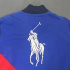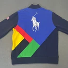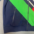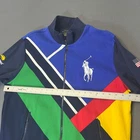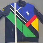 Polo Ralph Lauren US Open tennis track jacket features a vibrant colorblock design with bold diagonal stripes in green, blue, red, and yellow against a navy base. This full-zip performance piece showcases the iconic oversized Big Pony logo on the chest, an American flag patch on the left sleeve, and official US Open branding on the right sleeve. Constructed with a comfortable mock neck and secure zippered hand pockets, it offers a sporty silhouette perfect for athletic wear or casual styling. Keywords: Sporty, Tennis, Athleisure, Colorblock, Big Pony, US Open, Ralph Lauren, Preppy, Streetwear, Performance, Track Jacket, Americana, Bold, Vibrant, Activewear