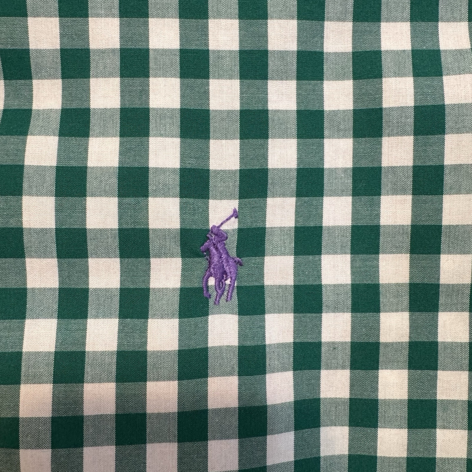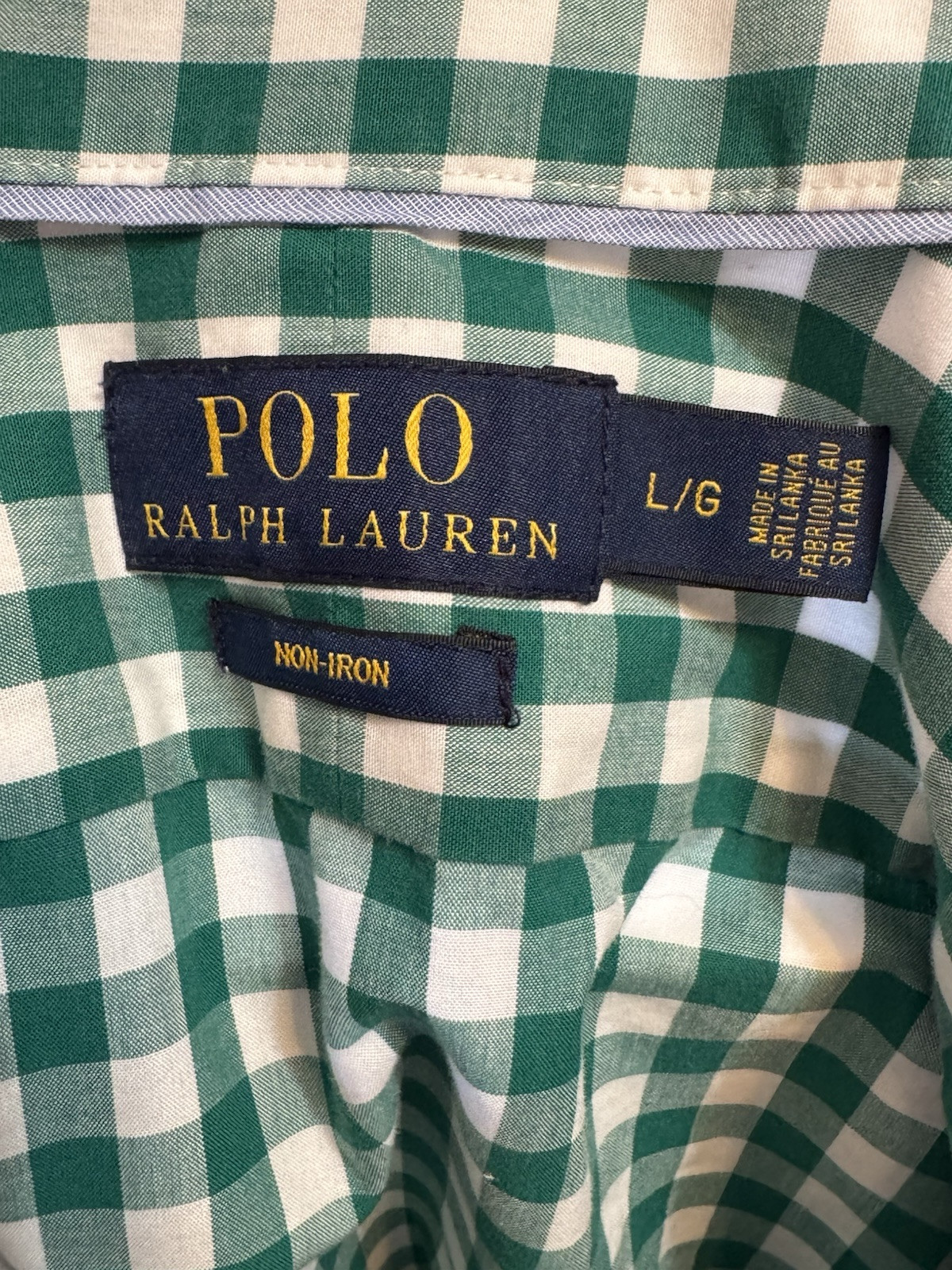 This Polo Ralph Lauren men's shirt in size Large features a green and white check pattern with a button-down collar and long sleeves. It is designed for casual wear and is suitable for various occasions such as travel, weddings, parties, and business events. The shirt is made of cotton and has a regular fit, making it a versatile and stylish addition to any wardrobe. A11