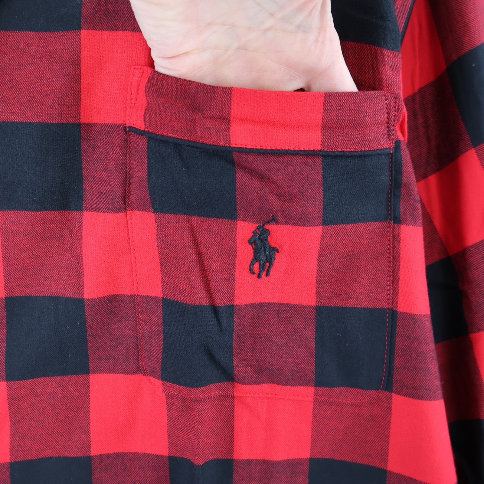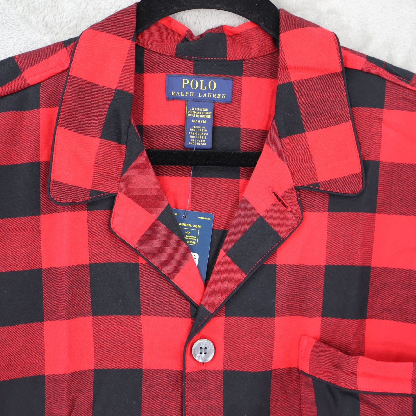 Polo Ralph Lauren sleepwear top features a classic buffalo plaid pattern in vibrant red and black. Crafted from soft 100% cotton, this button-down shirt includes a notched collar, a single chest pocket with the signature embroidered pony logo, and contrast piping for a refined finish. The lightweight woven fabric ensures comfort throughout the night. Perfect for lounging at home, holiday mornings, or as a cozy gift. Brand: Polo Ralph Lauren Product Type: Sleepwear Top Audience: Mens Size: Medium Color: Red, Black Pattern: Buffalo Plaid Material: 100% Cotton Closure: Button Front Neckline: Notched Collar Sleeve Length: Long Sleeve Pocket: Single Chest Pocket Features: Embroidered Pony Logo, Contrast Piping Measurements: • Chest: 22.5" (45" doubled) • Shoulder: 19.5" • Length: 31" • Sleeve: 26" New with tags. 7782 Keywords: Buffalo Check, Pajama Top, Lounge, Preppy, Classic, Holiday, Winter, Sleep Shirt, Cotton, Designer, Minimalist, Cabin Core