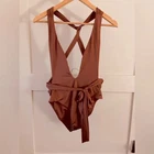 Defined by an alluring plunging neckline, this one-piece swimsuit features a halter silhouette and long straps that can be tied into several different styles . 85% Nylon 15 % Elastane Hand Wash Cold