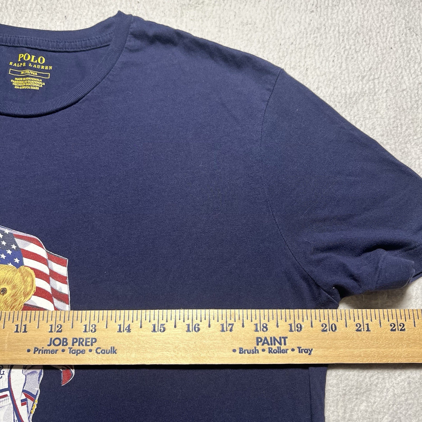 The Polo Ralph Lauren Polo Bear Shirt for men in size medium features a solid blue color with the Team USA flag graphic. This short-sleeve tee has a crew neck and is made of cotton, making it machine washable and suitable for the seasons of summer, fall, and spring. With an embroidered logo accent, this regular fit shirt from the Polo Ralph Lauren Polo Bear product line is a stylish and patriotic addition to any man's wardrobe.
