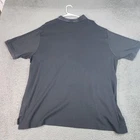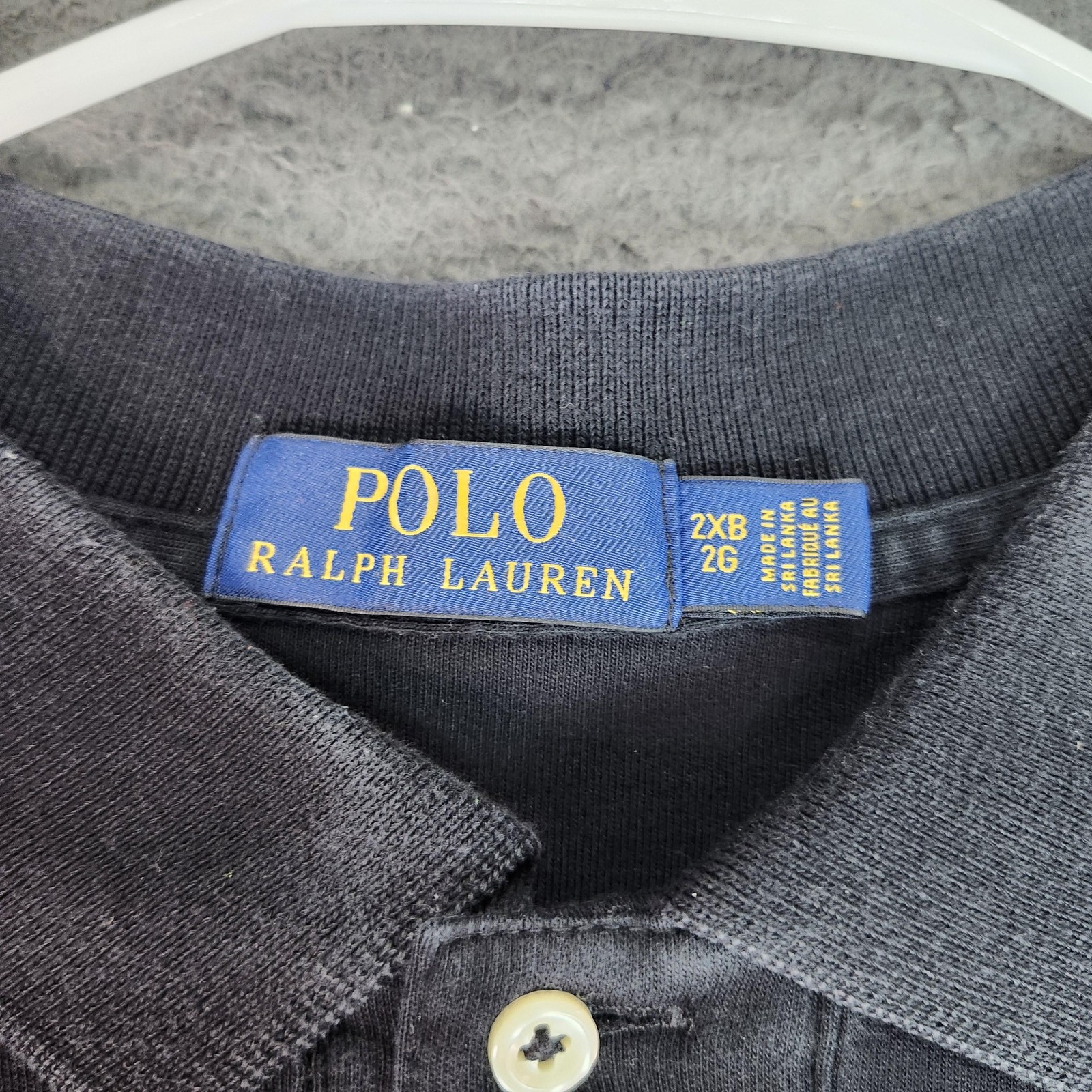 Brand: Polo Ralph Lauren Style: Mens short sleeve polo shirt with a classic collared neckline and two-button front placket. Color: Solid black. Size on tag: Mens 2XB (2G), big & tall size type. Material: Soft midweight knit fabric designed for everyday comfort. Details: Red embroidered polo player logo at left chest, ribbed knit collar and sleeve cuffs, tonal buttons at the placket, straight hem with small side vents, and solid back with no graphics. Additional info: Made in Sri Lanka as indicated on the inner neck tag; versatile basic polo suitable for casual wear or golf.