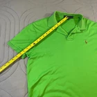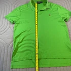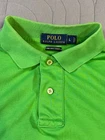 The product is a men's Polo Ralph Lauren polo shirt in size Large, featuring a classic green color with the signature Polo Ralph Lauren flesh pony logo embroidered on the front. Made from 100% cotton with a knit fabric type, this lightweight and breathable shirt is perfect for casual occasions during the summer and spring seasons. The collared neckline, button closure, and spread collar style add a touch of preppy charm, making it suitable for tennis, golf, or simply a stylish everyday look. Easy to care for with machine washable instructions, this polo is a timeless addition to any man's wardrobe.