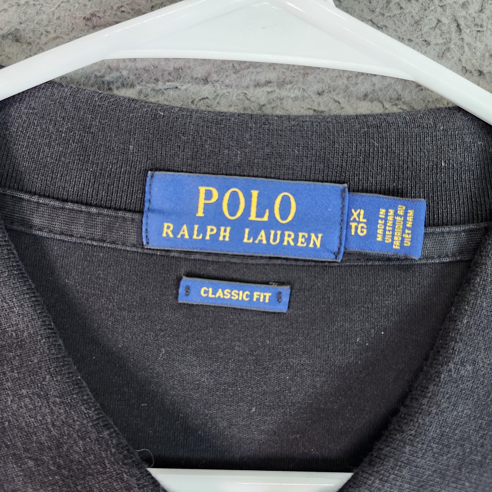 Brand: Polo Ralph Lauren Style: Mens short sleeve polo shirt with a classic collared neckline and button front placket. Color: Solid black. Size on tag: Mens XL (XL/TG), regular size type. Material: Soft midweight knit fabric designed for everyday comfort. Details: White embroidered polo player logo at left chest, ribbed knit collar and sleeve cuffs, straight hem with small side vents, tonal buttons at the placket, and solid back with no additional graphics. Additional info: Labeled Classic Fit on the inner tag; made in Vietnam as indicated on the neck label; versatile basic polo suitable for casual wear or golf.