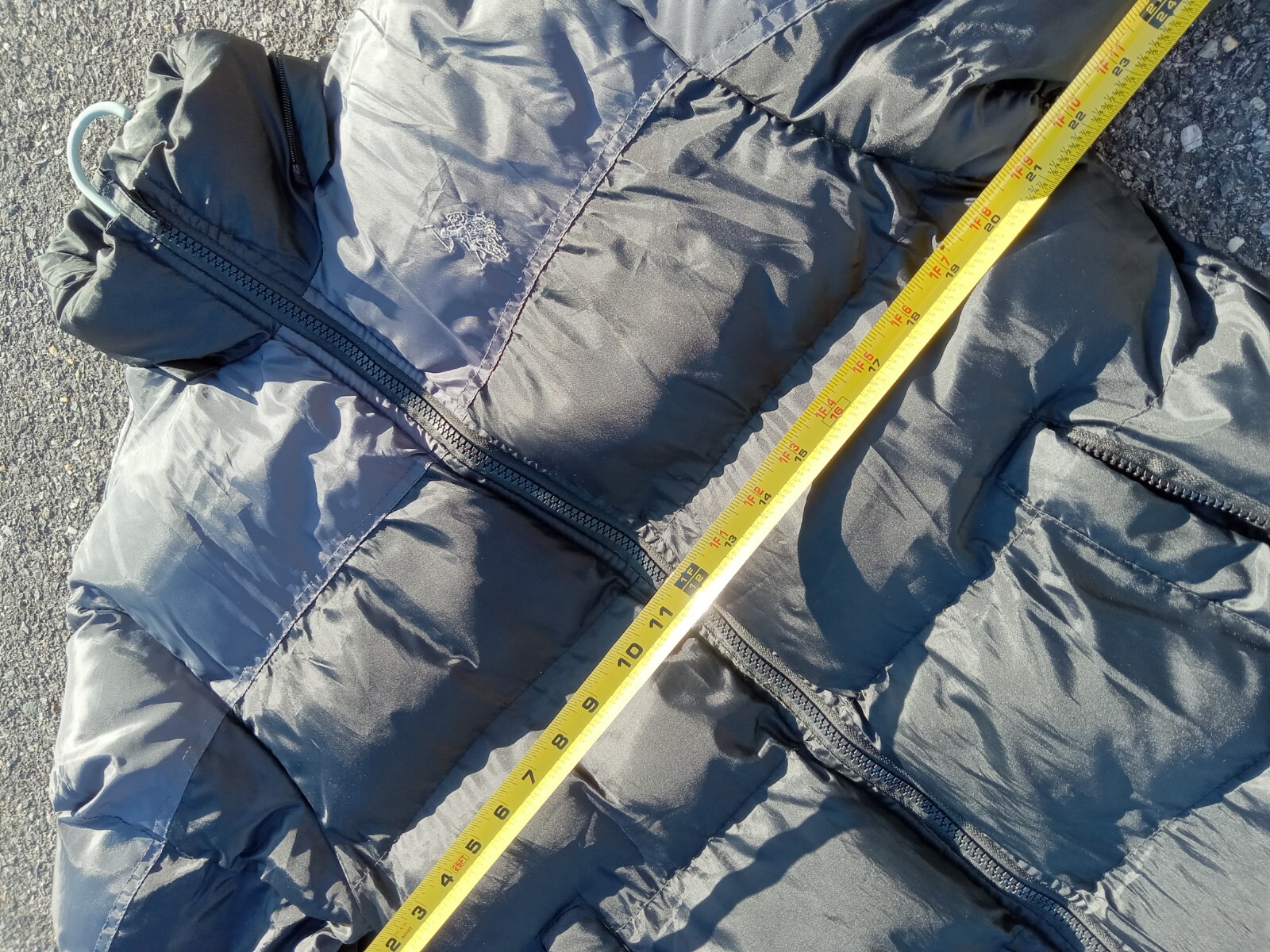 Puffer jacket with out hood. In good shape big and comfy fits more like a medium. Check the measurements. Black and grey.Grey. no stains or major damage.