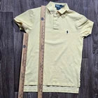 This classic Polo by Ralph Lauren short-sleeve shirt features the desirable "Custom Fit" silhouette, providing a more tailored look through the chest and waist than the classic fit. Crafted from breathable 100% cotton pique fabric, it offers a textured feel and superior comfort. The shirt is finished with the iconic embroidered navy blue pony on the chest, a two-button placket, and a stepped tennis tail hem. Perfect for smart-casual wear, golfing, or everyday layering. Pit-to-Pit: 18" Length: 24" (front) / 26" (back) Excellent pre-owned condition. The fabric retains great color with no significant fading. No holes, tears, or stains were noted during inspection. All buttons are original and securely attached.