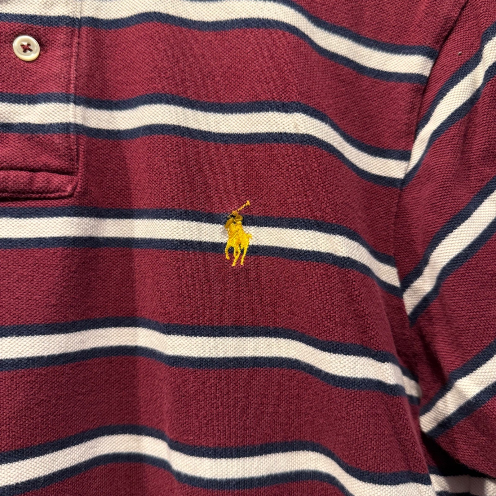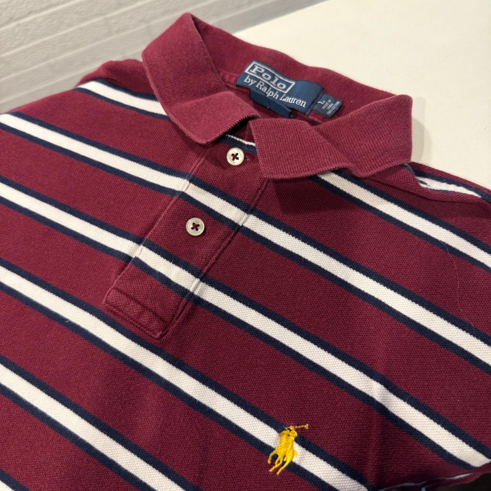 Striped polo shirt evokes a sense of relaxed sophistication. Horizontal stripes of burgundy, white, and navy create a visually appealing pattern, complemented by the iconic yellow Polo Ralph Lauren logo embroidered on the chest, adding a touch of brand recognition. This polo features a classic fit, short sleeves, and a traditional buttoned placket, making it a versatile piece for various occasions. Ideal for a casual weekend brunch, a relaxed day on the golf course, or a smart-casual office setting, this shirt provides comfort and style. Color: Red Department: Men Type: Polo Performance/Activity: Golf, Walking Sleeve Length: Short Sleeve Character: Goldie, Burgundy, Stripes, The Horse, Ralphie Pattern: Striped Material: 100% Cotton, Cotton Fit: Classic Features: Breathable, Easy Care, Tagless Neckline: Collared Keywords: Polo Ralph Lauren, Polo Shirt, Striped Polo, Burgundy Polo, Classic Fit, Mens Polo, Short Sleeve Polo, Logo Polo, Casual Shirt, Designer Polo, Ralph Lauren Shirt, Striped Shirt, Menswear, Preppy Style