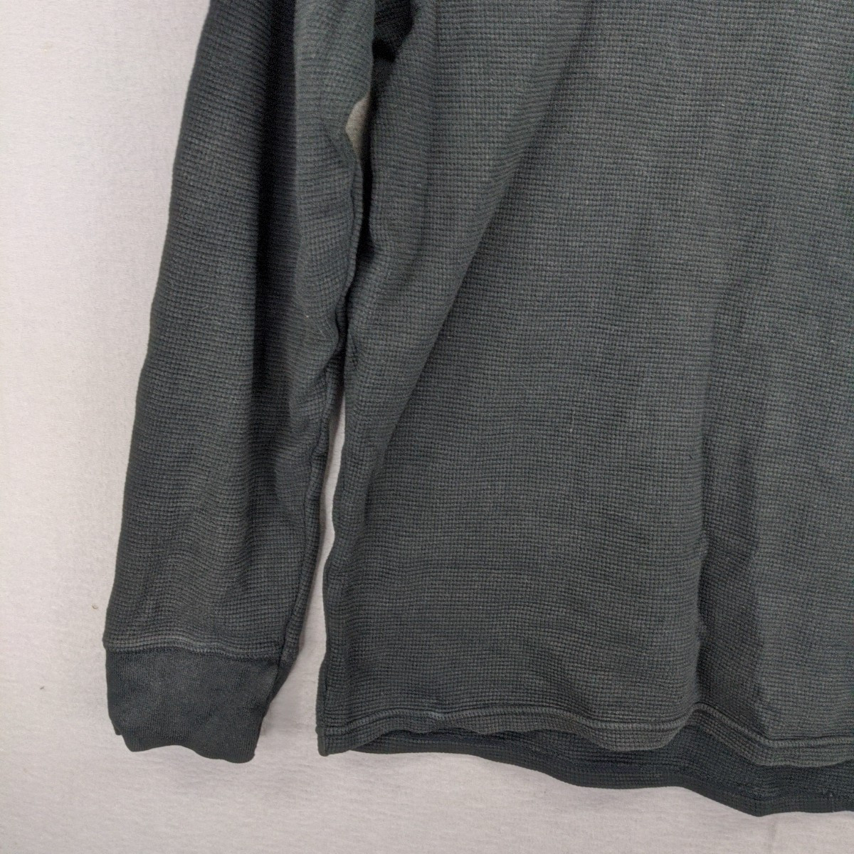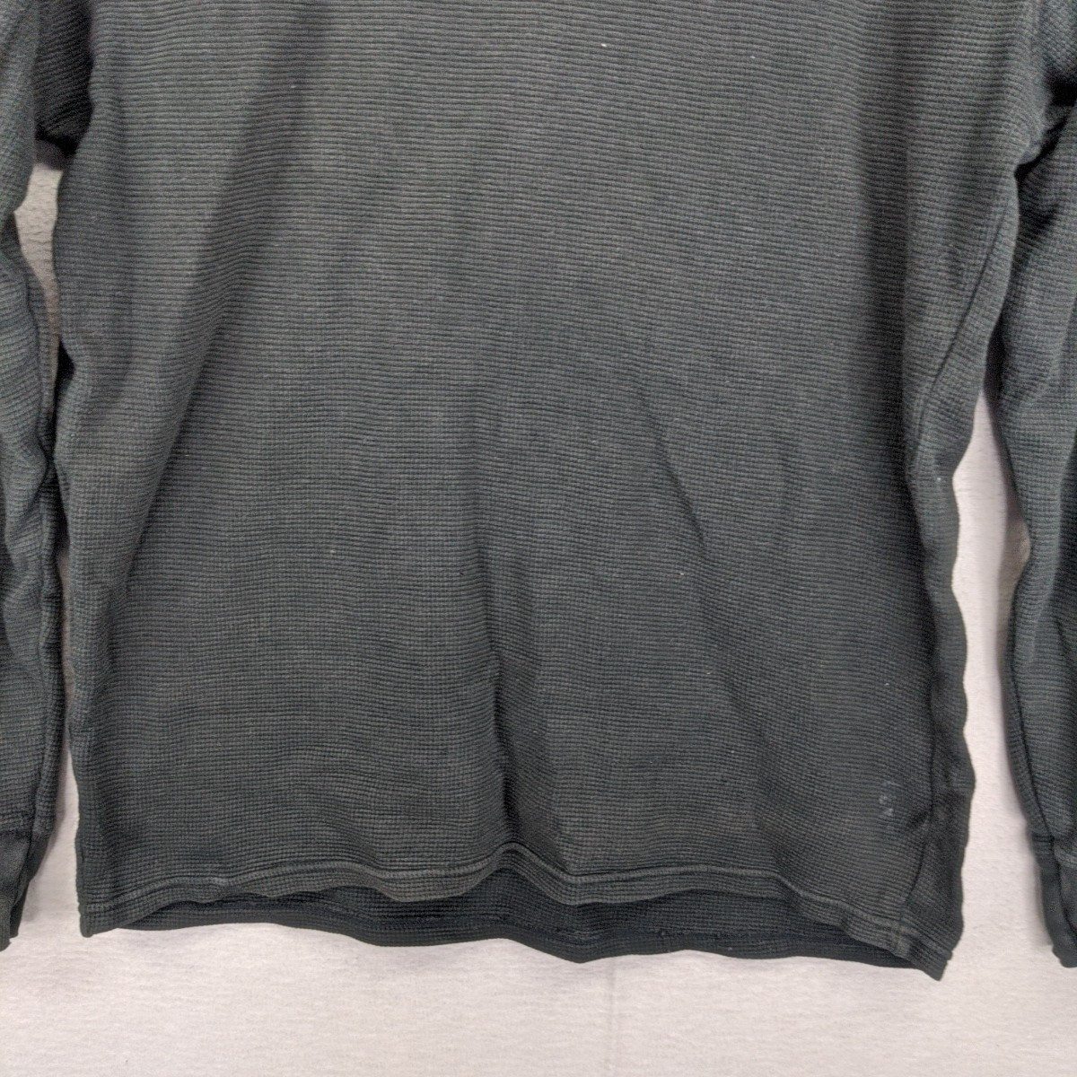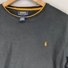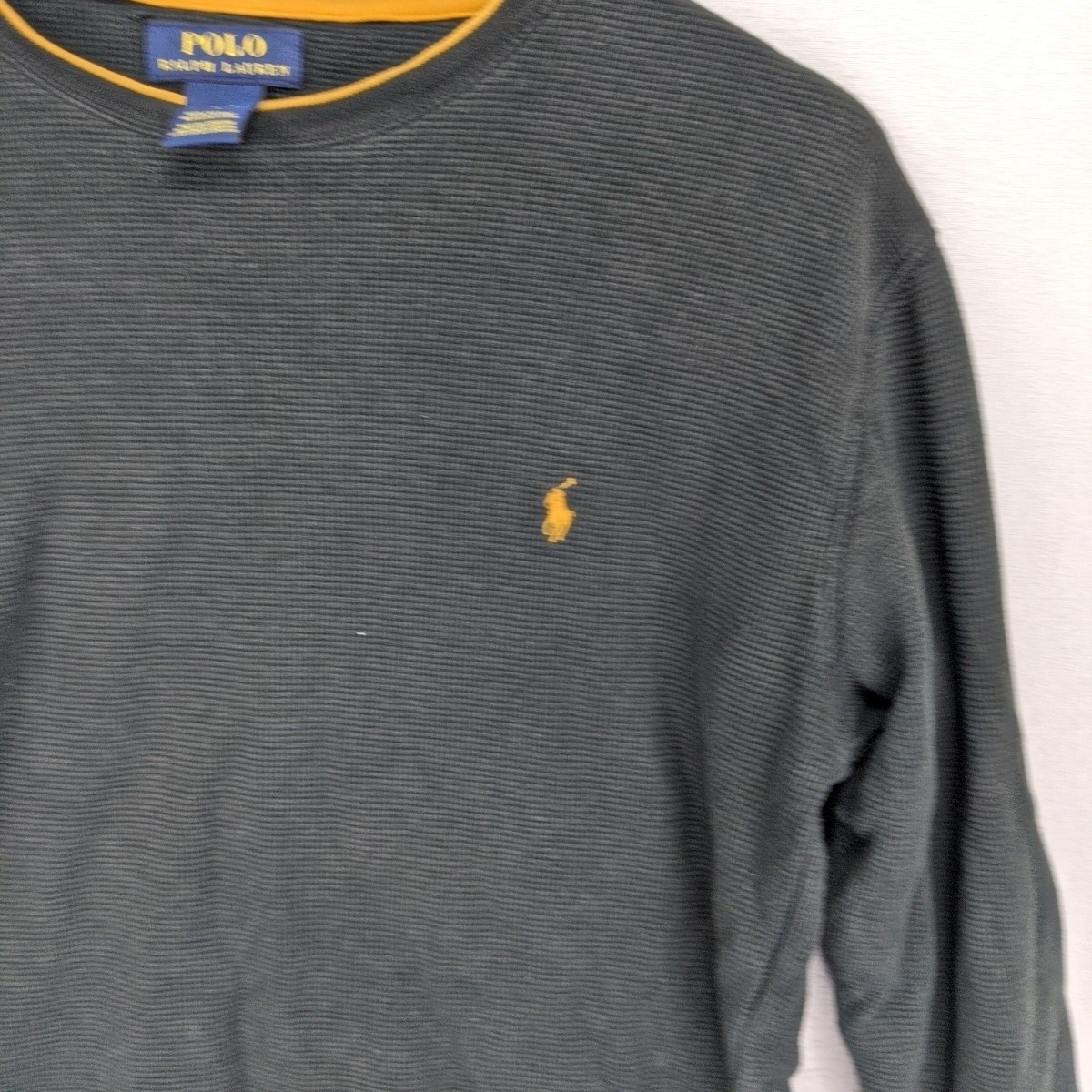 Polo Ralph Lauren Waffle Knit Long Sleeve T-shirt Black Gold Trim Sleepwear M NOTE: There is a hole present on the back of this garment. See pics for condition. Armpit to armpit: 49cm approx. Top to Bottom: 63cm approx. Disclaimer:product colour may slightly vary due to photographic lighting sources or your monitor settings