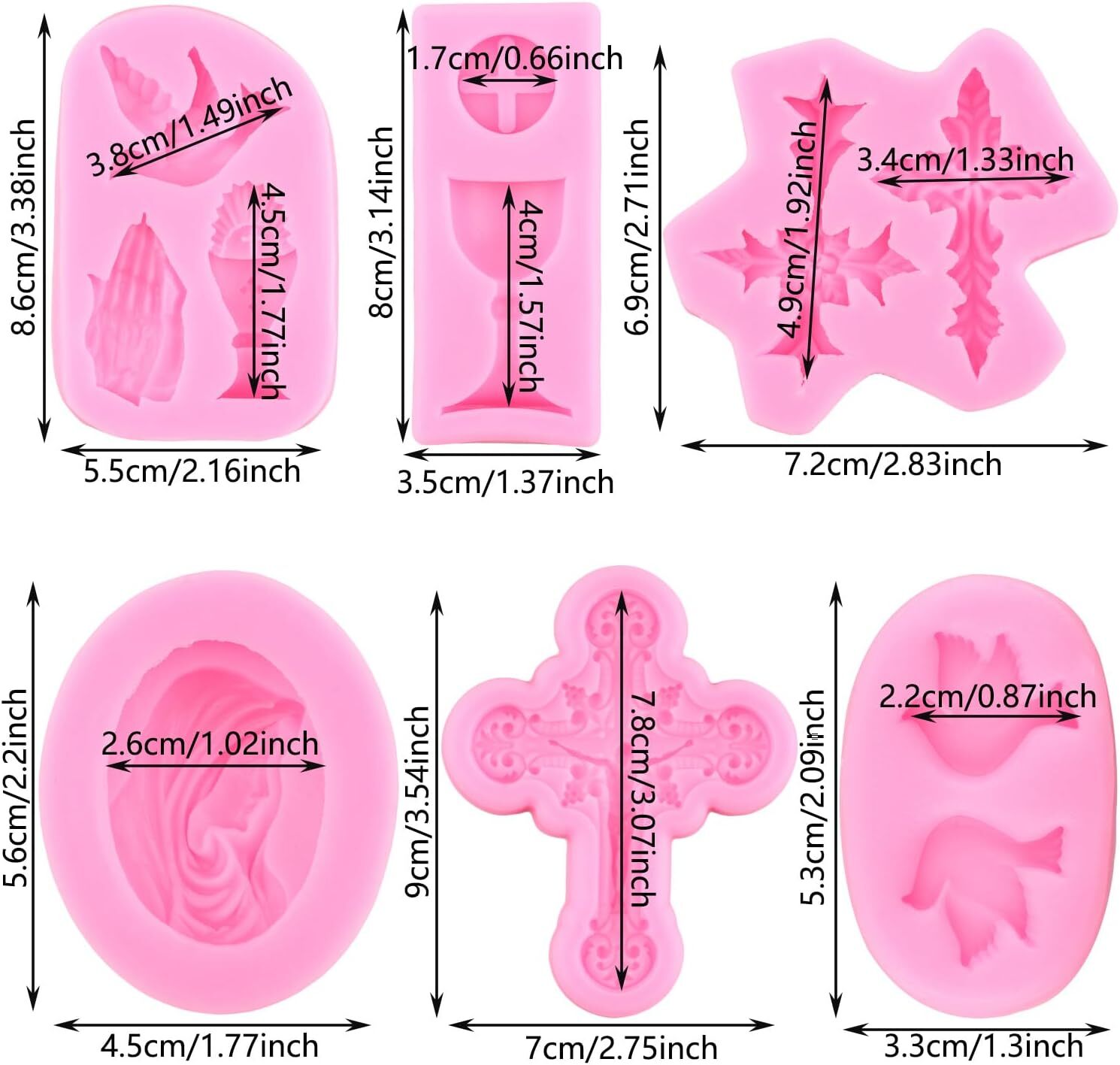 Product Description Product Description Top Quality Material Cross Cake Molds made of high quality food grade silicone,easy to wash and clean, flexible to use, durable and safe for use. Baptism Chocolate Molds can tolerate high temperature range from -40℃ to 230℃. Size:6 different styles of Baptism Cross Cake Mold 1Pcs Cross Fondant Mold: 2.71*2.83inch 1Pcs Cross Fondant Mold: 2.75*3.54 inch 1Pcs Communion Chalice Fondant Mold: 1.37*3.14 inch 1Pcs Communion Chalice Fondant Mold: 2.16*3.38inch 1Pcs Dove Fondant Mold: 1.3*2.09 inch 1Pcs Sister Fondant Mold: 1.77*2.2 inch Cross Candy Silicone Molds Best handmade gift,cute romantic design,prefect for Baptism Party Cake Decoration Molds,cupcake toppers,chocolate, jello shots, mini muffins, modeling clay, candy making molds. NOTES 1. Before first using, please wash with water to remove surface dust. 2. Don't use on open flames or over a direct heat source. 3. Don't pull and impact it violently or scratch it with sharp things. 4. In order to avoid the dust, don't directly exposure it to the air for a long time. 5. When baking, it' s better to put the mold in the flat baking tray as the silicone mold is soft. About ZiXiang We working for silicone molds and other home kitchen supplements for many years. We are striving to make high quality products and provide sincere service to every our customers. On May 15, 2025 at 23:12:22 PDT, seller added the following information: