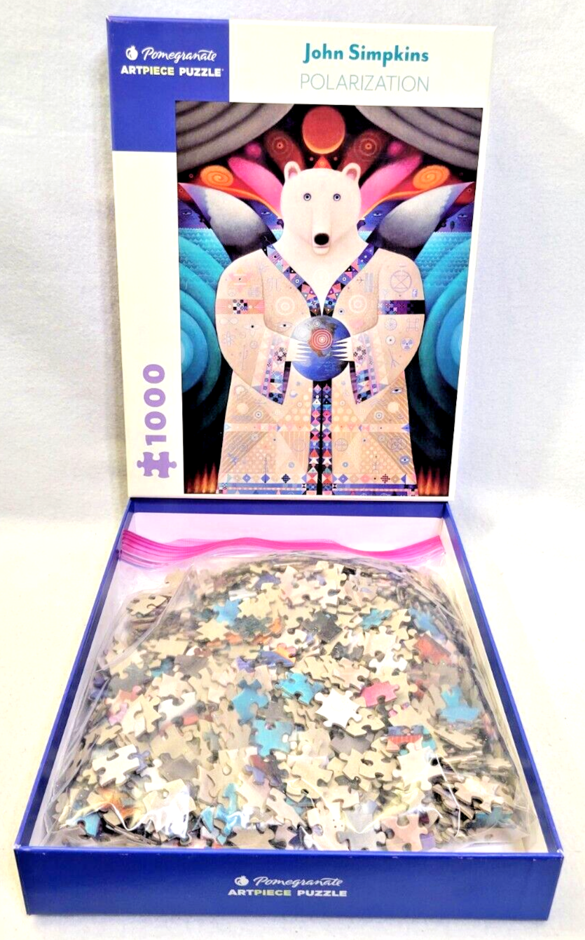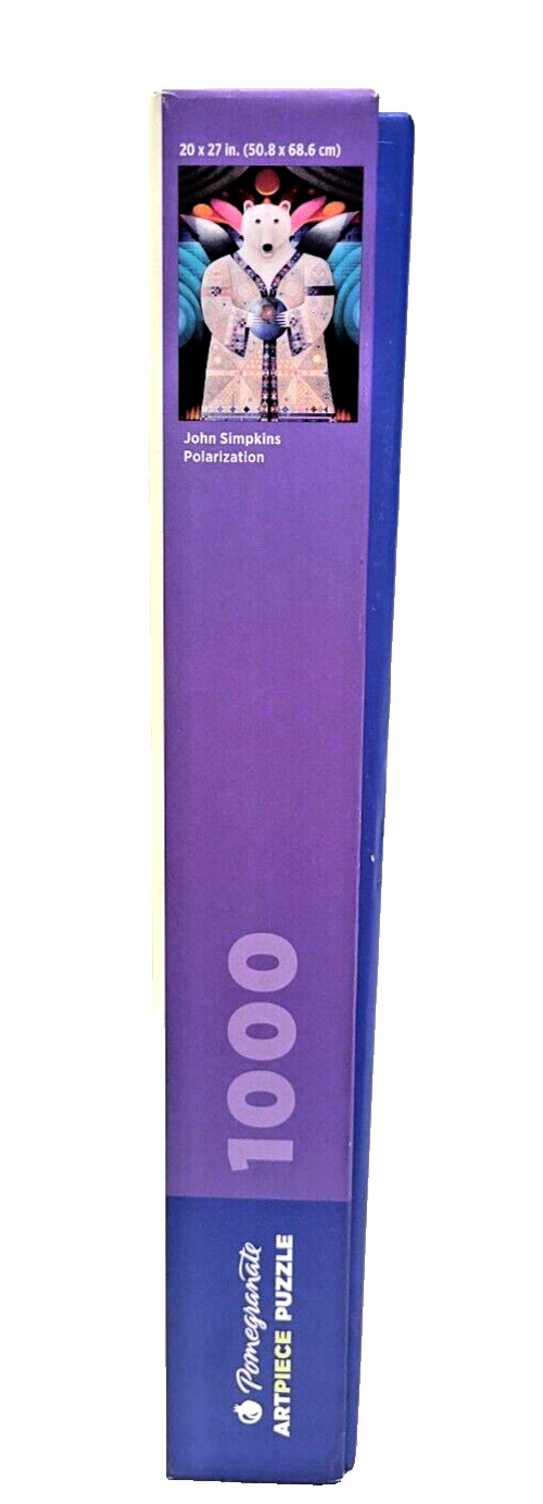 This wonderful 1000-piece puzzle features the breathtaking artwork of John Simpkins, depicting a beautiful polar bear in vibrant multi-color tones. The puzzle is made of high-quality cardboard material with interlocking pieces, ensuring a seamless and satisfying puzzle experience. Recommended for ages 8 and up, this puzzle is perfect for puzzle enthusiasts and collectors alike. The puzzle is complete, coming from a smoke-free household, and measures 20" x 27". Made in China, this puzzle is sure to provide hours of entertainment and relaxation. Doing puzzles has some hidden benefits . Excellent qualities : Cultivate concentration, patience, and temper your will Movement development : Train hand-eye coordination and precise small movements Spatial intelligence : Improve visual discrimination of colors and shapes Critical thinking ability : Understand the relationship between parts and the whole, and draw inferences from one example to explore the future Relaxes your mind : Relieve work pressure and release yourself Brain development : Enhance memory and may help prevent or slow brain degeneration * We did not work the puzzle or count the pieces, but we verify the number count at your request. Each item we ship is carefully packaged to prevent any damage and is shipped immediately with tracking.