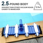 A H ot S u m m e r H o liday R equir e s a C le a n P o o l ! This swim mi ng pool vacu um head s uction head is made of high-quality plastic. There is 8 rollers at the bottom to achieve 360° all-round cleaning. Saving labour and time. Easy to connect your rotatable suction pipe. Suitable for large, medium and small swimming poo ls. 1 4" Pro Gr ade Wide Body Clean your p ool efficiently! Provides a more efficient cleaning experience. Flexible body hugs every contour of your pool's surface! 4 Integrated 2.5 lb Wei g hte d Pla te s H eavy weighted plates to ensure the vacuum sticks to the pool creating a consistent seal and remain submerged. B ottom & Side Brus hes Excellent at cle aning corners & narrow spaces, Safe for vinyl lined pools. 8 Heavy Duty Wheels 8 x heavy duty wheels provide smooth gliding motion and helps speed up the cleaning time. Hose Connecting Size of suction nozzles fits 1-1/2" pool vacuum hoses (Not Included). Strong & Flexib le Handle with EZ Clips Plastic pole handle with EZ clips for a fast and easy installatio n, fits most standard 1-1/4" pool poles (Not Inclu ded ) . WIDE APPLICATION