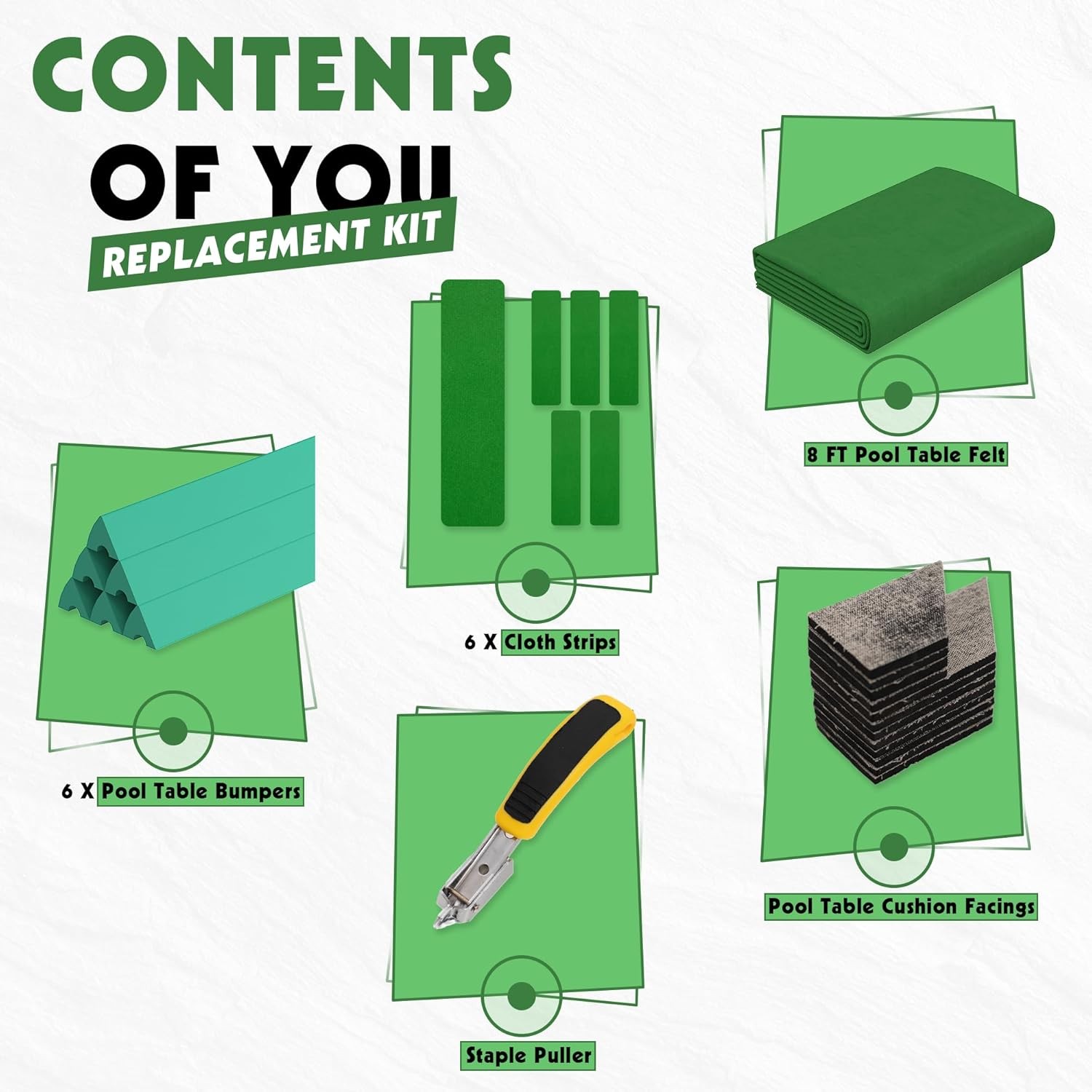 Store New Arrivals Add to Favorite View Feedback Contact Pool Table Felt and Bumper Kit Felt for Billiard Cloth with Pool Table Bumpers and Cushions Facing, 6 Pcs Cloth Strips and Staple Remover Description Style Green Assembly Required Yes Color Green Set Name 8ft Pool Table Felt and Bumper Kit Material Polyester Package Weight 10 Pounds Suggested Users Adult Top Material Type Polyester Model Name PTFB8G Number of Players 4 Sport Billiards Item Package Dimensions L x W x H 15.75 x 12.99 x 6.3 inches Size 8FT + 42'' Bumpers 【Contents of replacement kit】1 X 8FT Pool Table Felt, 6 X Cloth Strips, 6 X Pool Table Bumper , 12 X Pool Table Cushion Facings, 1 X Staple Puller 【Dimensions】Suitable for 8ft pool table, Pool Table Felts(104"L x 57"W),Cloth Strips(53"L x 6"W),Pool Table Bumper(43.25"L x 1.1"W x 0.9"H) 【High-strength fiber materials】This pool table cloth is made of polyester fiber, ensuring excellent abrasion resistance, which allows the fabric to withstand long-term use without easily wearing out 【Multiple colors】We offer 6 different colors to choose from. Replace your old pool table cloth to give your billiard room a fresh new look. 【Premium Staple Puller】It can easily grip the staples and quickly remove them, reducing the time and effort required for manual operation. Product description ABOUT US We offer the best prices around on high quality products. Our E-store includes media such as books, movies, music and games while offering electronics, toys, sporting apparel, clothing, tools, general home, garden items and more. SHIPPING We are always working hard to ensure your package arrives as soon as possible. Please understand that some factors like weather, high postal traffic, and the performance of shipping companies are outside of our control. We offer free shipping to the lower 48 states and ship within 2 business days of payment, usually sooner. We do not accept P.O. Boxes. Please provide a physical address. For shipping outside of the continental USA, we only use eBay's Global Shipping Program.The item is shipped to KY and then sent to the rest of the world. International customers are responsible for all duties and taxes. Continue to check out in order to calculate costs for shipping the item to your country. Messages regarding eBay's Global Shipping Program MUST be directed at eBay EXCLUSIVELY. RETURNS We offer a 30-Day Return Policy on items which you are not completely satisfied with. You have the option for a full-refund or an exchange of the item. No returns are available on items shipped outside of the USA. PAYMENT We accept PayPal. CONTACT US This page content is yet to come Please ad us to your favorite seller and visit again later Thank You CUSTOMER SATISFACTION We try our very best to make sure every customer is completely satisfied. If there's a problem, message us! We're happy to help. WE ACCEPT Copyright © 2021 AutoDS. | All Rights Reserved