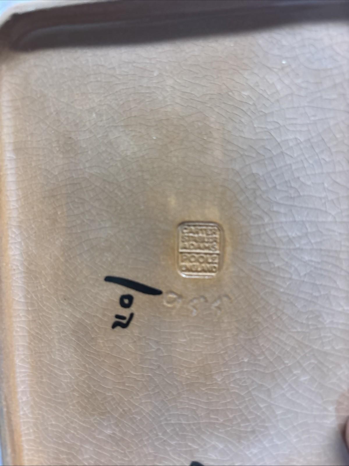 The Poole Pottery Hand Painted Rectangle Covered Butter Dish is a unique and stylish addition to any kitchen or dining table. Featuring an abstract pattern in a colorful design, this stoneware dish is perfect for all occasions. With a sleek rectangular shape and dimensions of 7 inches in length, 6 inches in width, and 3 1/2 inches in height, it is both functional and decorative. The hand-painted details add a personalized touch to this practical covered dish. Listing and template services provided by inkFrog