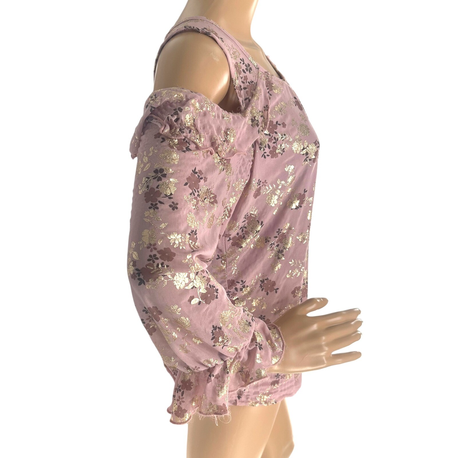 Poppi Floral Cold Shoulder Top Gold Accents Ruffle Sleeve Blouse M Balletcore Chic blouse, featuring a beautiful floral pattern with gold accents that catch the light. This top has a unique cold shoulder design with delicate ruffle detailing on the sleeves and hem, adding a touch of femininity. The lightweight fabric and comfortable fit make it perfect for both casual and dressy occasions. Pair it with jeans for a daytime outing or dress pants for a night out. Color: Pink Type: Blouse Department: Women Style: Basic Material: Polyester, Spandex Neckline: Scoop Neck Sleeve Length: Long Sleeve Sleeve Type: Cold Shoulder Sleeve Accents: Ruffle, Glitter Pattern: Floral Features: Lightweight, Ruffle Hem, Gold Accents, Sheer, Lined Fit: Regular Measurements approx. taken flat: Bust 18"/Waist 18.5"/Length 22.5" Condition: Good. Some fraying at cuffs Keywords: gold accents, ruffle sleeve, party top, casual blouse, dressy top, floral print, boho