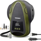 AC/DC OUTLET & MULTI-PURPOSE: TEROMAS tire inflator unique AC/DC with 12V car cigarette light plug as well as 110/120V wall plug for home outlet makes this inflator more useful since you can use it anywhere. Come with 3 additional adaptors which makes it perfect for cars, RV, motorcycles, bikes tires, air mattress, inflatable boats, balls and other inflatables.(NOTICE: NOT SUPPORT FOR HEAVY DUTY TRUCK OR TRACTOR TIRES) STRONG POWER & SPACE-SAVING: Up to 150 PSI, Inflate the P195/65R15 car tire from 0 to 35psi under 4min. It makes inflating tires in emergency easier and more convenient. Portable size which take up very little space and allow you keep it in your automobile or home. PROGRAMMABLE INFLATION: Use the "R" button to set your desired pressure unit, and then press the "+" and "-" buttons to set the desired pressure. The air compressor will automatically shut off when it reaches the pre-set pressure (Please make sure the pressure you set is higher than the current pressure of your tire). DIGITAL DISPLAY & LED Lighting: Bright backlight LCD display makes for convenient use at night. As well as being bright enough to see under strong sunlight, The air compressor gauge can display the pressure in PSI, BAR & KG/CM². TEROMAS air pump is equipped with bright and long-lasting LED lights, easy to use even in the dark. 100% SATISFACTION: This is a great tool to take along with your driving tours, use it anytime you need. Meanwhile, any problems, please feel free to contact us. We will do our best to help you. GET 100% SATISFACTION. Product Description Package includes: 1 x Air Compressor 4 x Nozzle Adapters 1 x User Manual 1 x AC Cable for Home Use 1 x DC Cable for Car Cigarette Lighter 1 x Replaceable Fuse Not Included the Carrying Bag Specific features of our air compressor: Auto shut-off function; Set of nozzle adaptors; Digital display and LED work-light for easy use; AC (110V) and DC (12V) adaptable for home and car using. Digital Portable Powerful AC DC Tire Inflator TEROMAS presents you with a premium quality programmable air compressor. This portable tire inflator comes with two power cords (110V and 12V) making it convenient to use both on the road and indoors. This product is designed for compact portability. Kindly Notes: The air compressor can not be used on big truck and motor lorry. When connect the AC outlet at the first time, please wait 5 seconds to let the air pump energize. Avoid over-inflating, never exceed the recommended pressure. Items over inflated may burst and cause serious injury. Inflate 10 or 15 minutes let it have a break for 10 minutes. Digital LCD Display Four Nozzle Attachments Bright LED Light Replaceable Fuse