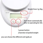 Digital Food Scale, Food Kitchen Scale Digital Cooking Weight Scale Food Scale Bowl with Ounce Grams High Accuracy Tare Auto Off Multifunctional Function(Bowl & Battery Included) Bullet Point ACCURATE & HIGH-PRECISION - If the value is different after you weigh same item. Please have a try to calibrate the scale. Our digital kitchen scale built with high precision strain gauge sensor system, provides you with accurate weight 11lb/5kg capacity, 0.001lb/0.01oz/1g accuracy. you will always get the right amount of foods, medicine, liquids and spices for all of your recipes. STYLISH COMPACT DESIGN - The sleek scale allows you design your home kitchen with a modern fashion touch or effortlessly hang the scale stow as a decoration, slim design also makes it easy to store in any cabinet while saving space for the rest of your kitchen essentials. MULTIFUNCTION SCALE - Features a clear LCD display in lb, oz, g. low power, overload indication and auto-off function after 2 minute of inactivity make weighing your foods hassle-free. The digital food scale with anti-slip bottom, perfect for baking, cooking, weighting small package etc. EASY TARE - The precise tare button of the kitchen scale lets you deduct the weight of a container from the total weight so that you can calculate the net weight of the contents easily, suitable for both dry ingredients and liquids. such as milk, grains, button, drugs, chemicals. Pictures Description Features: 1. Simply Superior: The Multifunctional Digital Kitchen Scale simplifies the way you prepare your meals through thoughtful and practical design. It features a detachable bowl for easier portioning, mixing ingredients, and quick volume measurement. Its versatile functionality helps you cut down on time and clutter when preparing meals at home. The open oval shape of the bowl makes it easier to stir and pour without making a mess. Measure virtually any ingredient up to 11-pounds while accurately portioning your plate for healthier living. 2. Multiple Units: Effectively measure in g, lb, oz, ml, fl. Switch between them, need you press the button on the bottom of scale. 3. Tare Function: Weigh smaller ingredients and liquids inside the included bowl without weighing the bowl itself. 4. Clear LCD: Easily read all of your measurements on a crystal clear LCD display. 5. Easy Storage: Remove the bowl and flip it over on top of the scale to save space in your kitchen cabinet or drawer. 6. Versatile Use: Use the bowl to mix both wet and dry ingredients for batters, dips and dressings. The scale can also differentiate the density between water and milk so you know exactly how much of your ingredients you are using. 7. Cook Without Limits: Place other containers onto the scale to measure your ingredients. No need to limit yourself to the included bowl. Specifications: Color: White LCD display Capacity: About 200oz (12.5lb)/ 5000g (5kg). Accuracy: 0.1oz / 1g Unit Switch: oz, lb and g. Power Supply: 2 x 1.5V AAA battery Calibration is not required before first use. Only calibrate if the scale is not weighting properly. Net weight: 160g Dimension: 163mm x 128mm x 32mm (L x W x H) Unit Package Weight: 255g Unit Package Size: 180x154x42mm (L x W x H) Package including 1 x Kitchen Electronic Scale 1 x Bowl 1 x User Manual 2 x Batteries Shipping and Payment Only PayPal accepted Your order will be shipped within 1-2 business days From Texas once we receive your payment. We do not ship on Sundays or public holidays Ship to PayPal confirmed address ONLY Return We stand behind our products. Items can be returned for exchange or full refund within 14 days from the date you receive your merchandise. For all cases, shipping and handling fee is not refundable and buyer is responsible for the return shipping cost. If it is a non-seller mistake case, a 20% restocking fee will be charged. Warranty and Feedback We guarantee you a five star shopping experience with us. If you are not satisfied with your purchase, please contact us. All faulty due to improper installation or improper use will NOT be covered by the warranty. Any physical damage will void your warranty too. Feedback will be left automatically when your item is shipped. We appreciate you leave 5 STAR of Detailed Seller Rating and POSITIVE Feedback for us upon receipt of your item. Warranty excludes normal product lifetime wear-out, wear and tear or abuse. Warranty does not apply to conditions resulting from misuse, abuse, negligence, accident, improper application, improper installation or alteration. If you encounter any problems about anything, please email us to allow us an opportunity to correct any problem and we will do our best to assist you solve the issue.